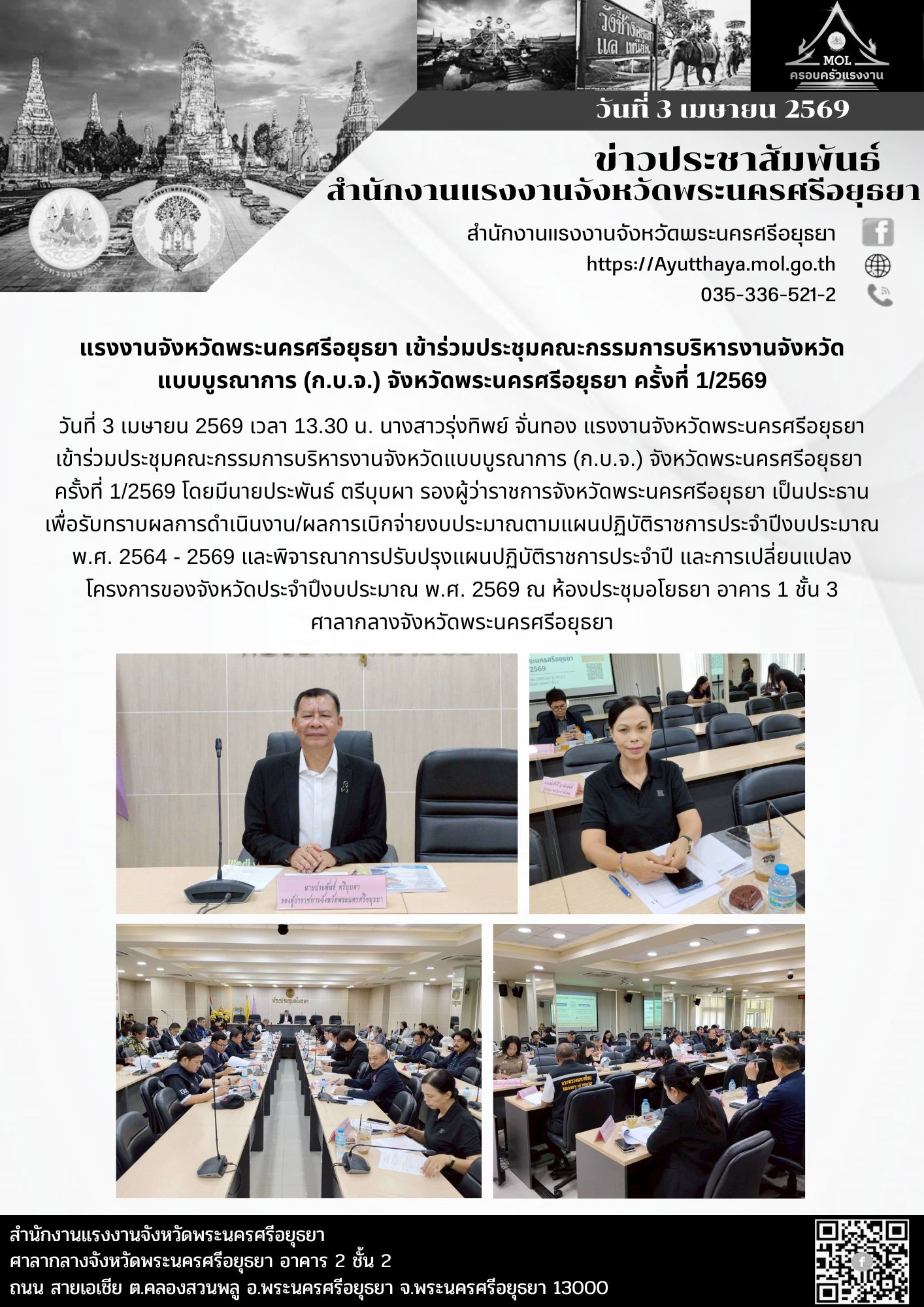 แรงงานจังหวัดพระนครศรีอยุธยา เข้าร่วมประชุมคณะกรรมการบริหารงานจังหวัดแบบบูรณาการ (ก.บ.จ.) จังหวัดพระนครศรีอยุธยา ครั้งที่ 1/2569