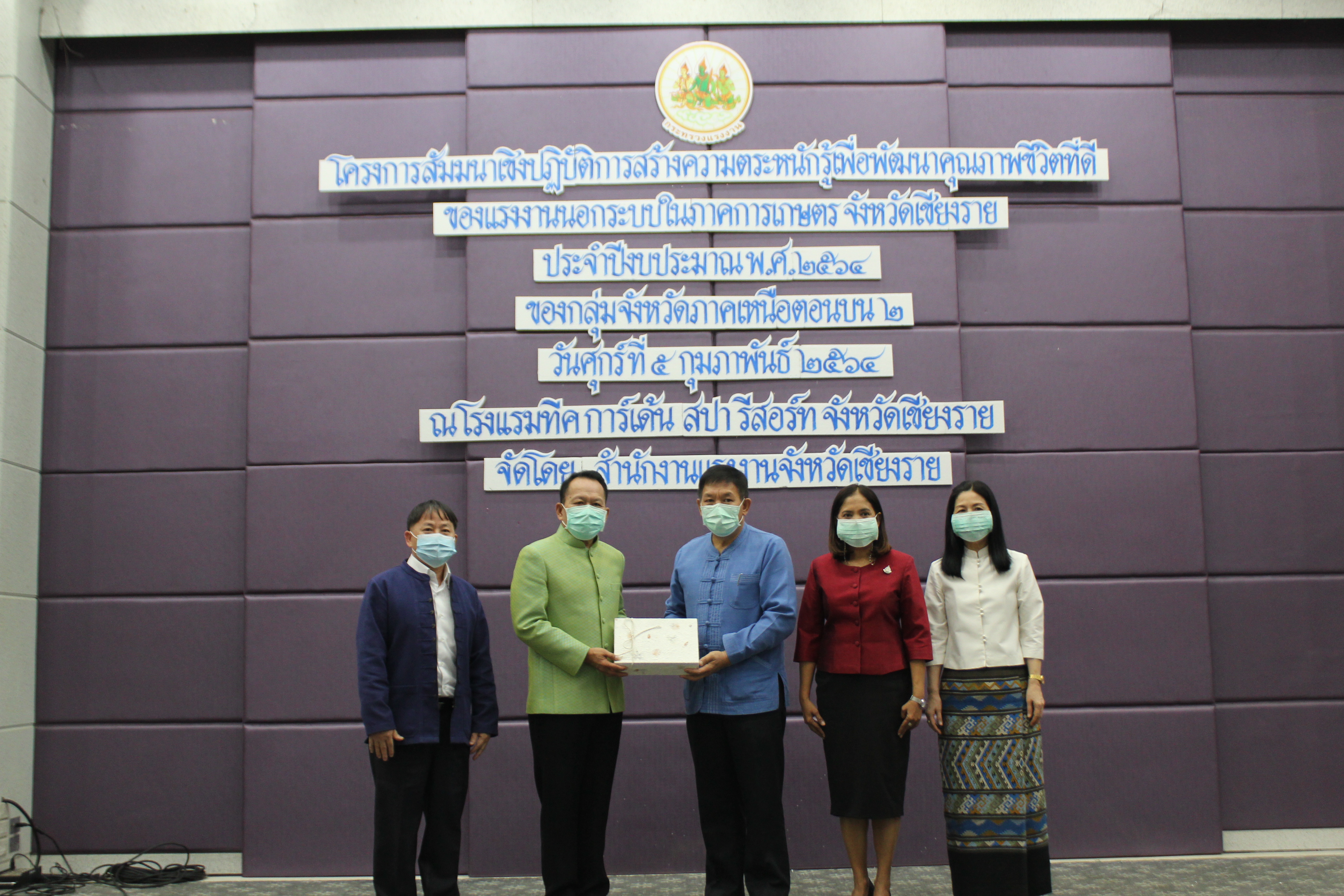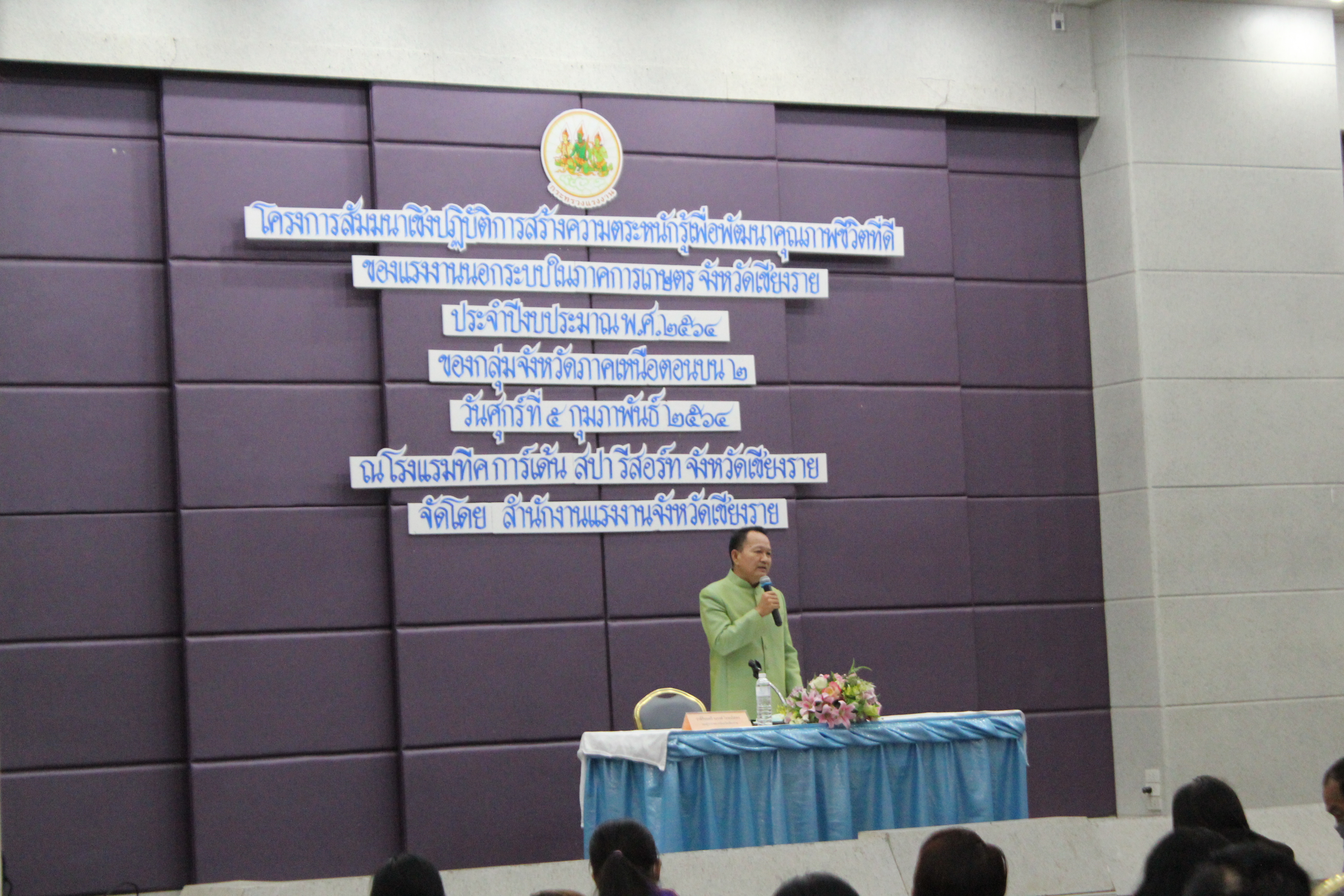 วันศุกร์ ที่ ๕ กุมภาพันธ์ ๒๕๖๔ ณ ห้องประชุมแกรนด์ราชพฤกษ์ โรงแรมทีคการ์เด้น เชียงราย (ถนนสนามบินนานาชาติ แม่ฟ้าหลวงเชียงราย) ตำบลบ้านดู่ อำเภอเมืองเชียงราย จังหวัดเชียงราย สำนักงานแรงงานจังหวัดเชียงราย จัดสัมมนาเชิงปฏิบัติการสร้างความตระหนักรู้เพื่อพัฒนาคุณภาพชีวิตที่ดีของแรงงานนอกระบบในภาคการเกษตร ตามแผนปฏิบัติราชการประจำปีงบประมาณ พ.ศ.๒๕๖๔ ของกลุ่มจังหวัดภาคเหนือตอนบน ๒ กลุ่มเป้าหมายเป็นอาสาสมัครแรงงาน และแรงงานนอกระบบ จำนวน ๒๐๐ คน โดยมี ว่าที่ร้อยตรีณรงค์ โรจนโสทร รองผู้ว่าราชการจังหวัดเชียงราย เป็นประธานในพิธีเปิด และมีนายขจรวงศ์สวยแรงงานจังหวัดเชียงรายกล่าวต้อนรับและกล่าวรายงานถึง วัตถุประสงค์ในการจัดการสัมมนาในครั้งนี้