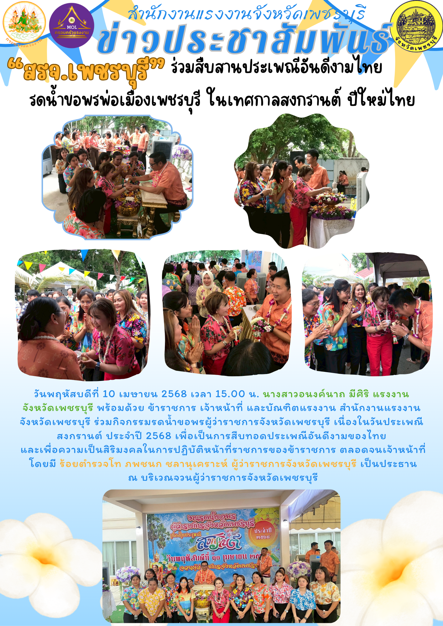 วันพฤหัสบดีที่ 10 เมษายน 2568 เวลา 15.00 น. นางสาวอนงค์นาถ มีศิริ แรงงานจังหวัดเพชรบุรี พร้อมด้วย ข้าราชการ เจ้าหน้าที่ และบัณฑิตแรงงาน สำนักงานแรงงานจังหวัดเพชรบุรี ร่วมกิจกรรมรดน้ำขอพรผู้ว่าราชการจังหวัดเพชรบุรี เนื่องในวันประเพณีสงกรานต์ ประจำปี 2568 เพื่อเป็นการสืบทอดประเพณีอันดีงามของไทย และเพื่อความเป็นสิริมงคลในการปฏิบัติหน้าที่ราชการของข้าราชการ ตลอดจนเจ้าหน้าที่ โดยมี ร้อยตำรวจโท ภพชนก ชลานุเคราะห์ ผู้ว่าราชการจังหวัดเพชรบุรี เป็นประธาน ณ บริเวณจวนผู้ว่าราชการจังหวัดเพชรบุรี