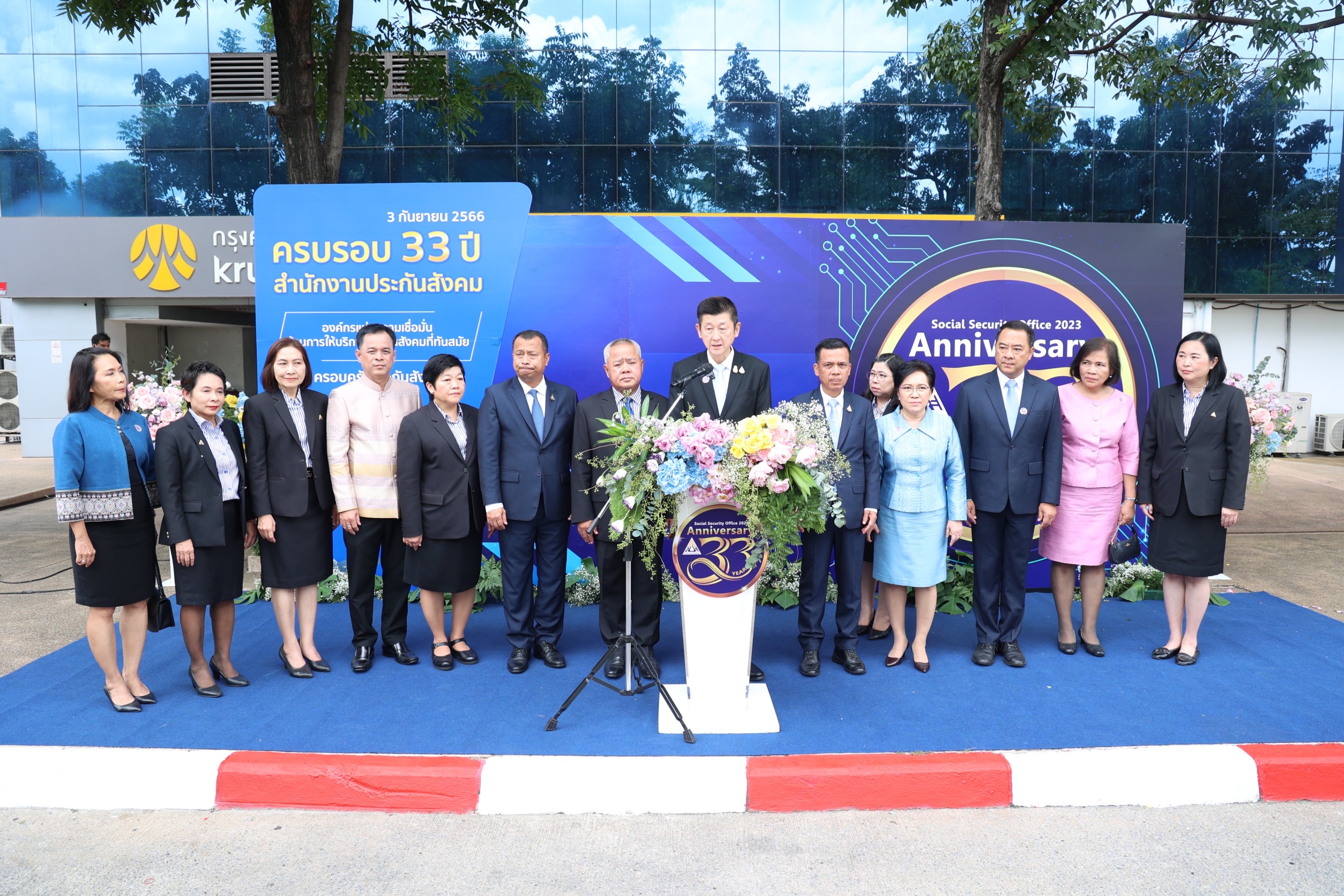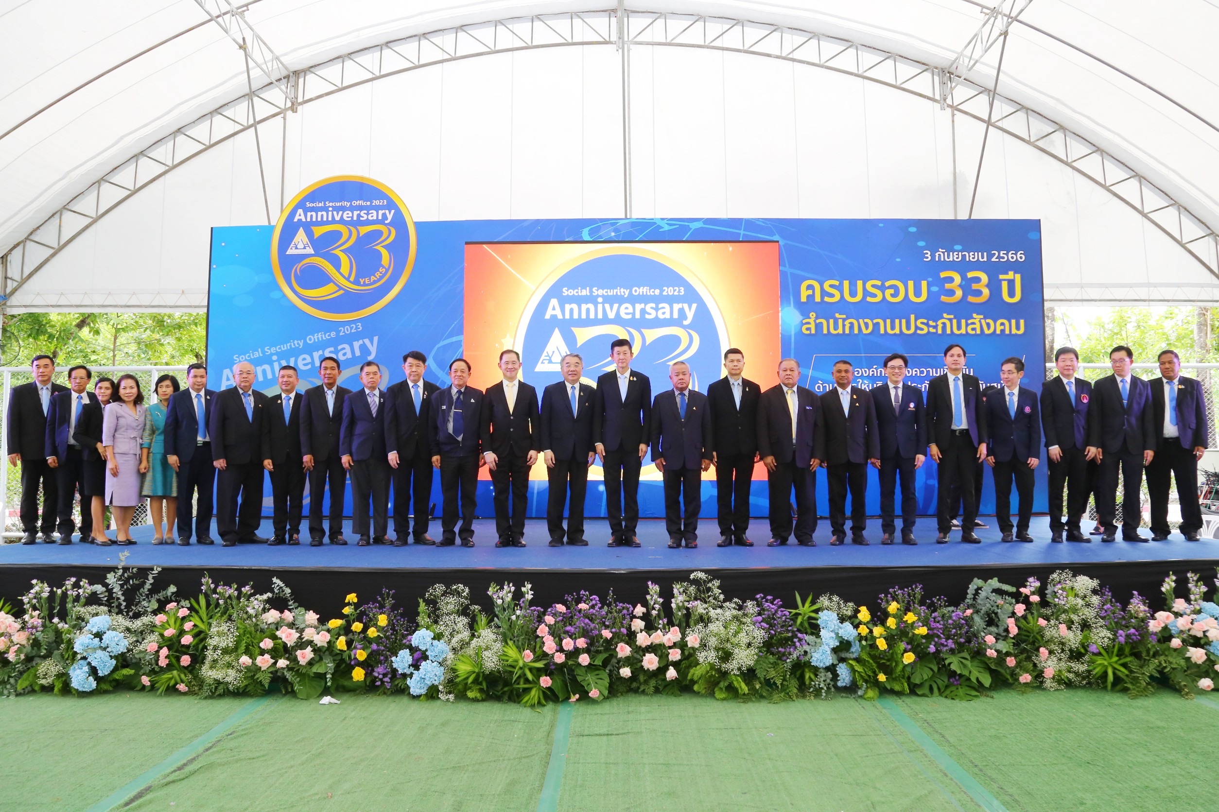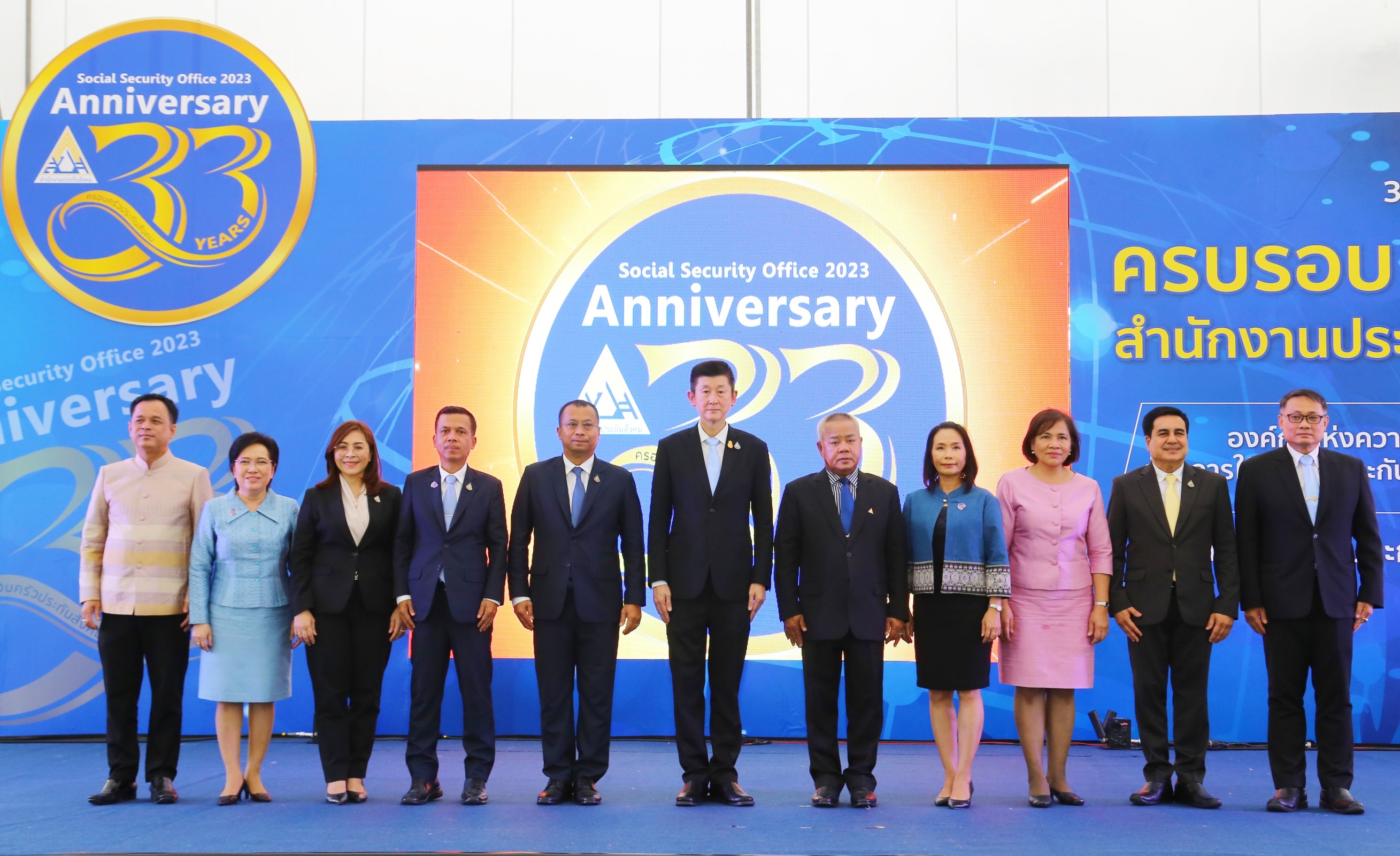 On September 3, 2023, the Permanent Secretary of Labour, Mr. Boonchob Suttamanaswong, presided over the Social Security Office’s 33rd anniversary event. The Deputy Permanent Secretary of Labour, Mr. Prateep Songlamyong, the Deputy Permanent Secretary of Labour, Mr. Wannarat Srisuksai, and the Ministry of Labour’s executives joined the occasion. The Social Security Office’s Secretary-General, Mr. Boonsong Thapchaiyut, the executive committee, the Social Security Board, the Compensation Fund Committee, directors of various committees, executives of medical establishments, leaders of social security networks, and Social Security Office officials gave a welcome at the Social Security Office, Tiwanon Road, Talad Khwan Subdistrict, Mueang District, Nonthaburi Province.