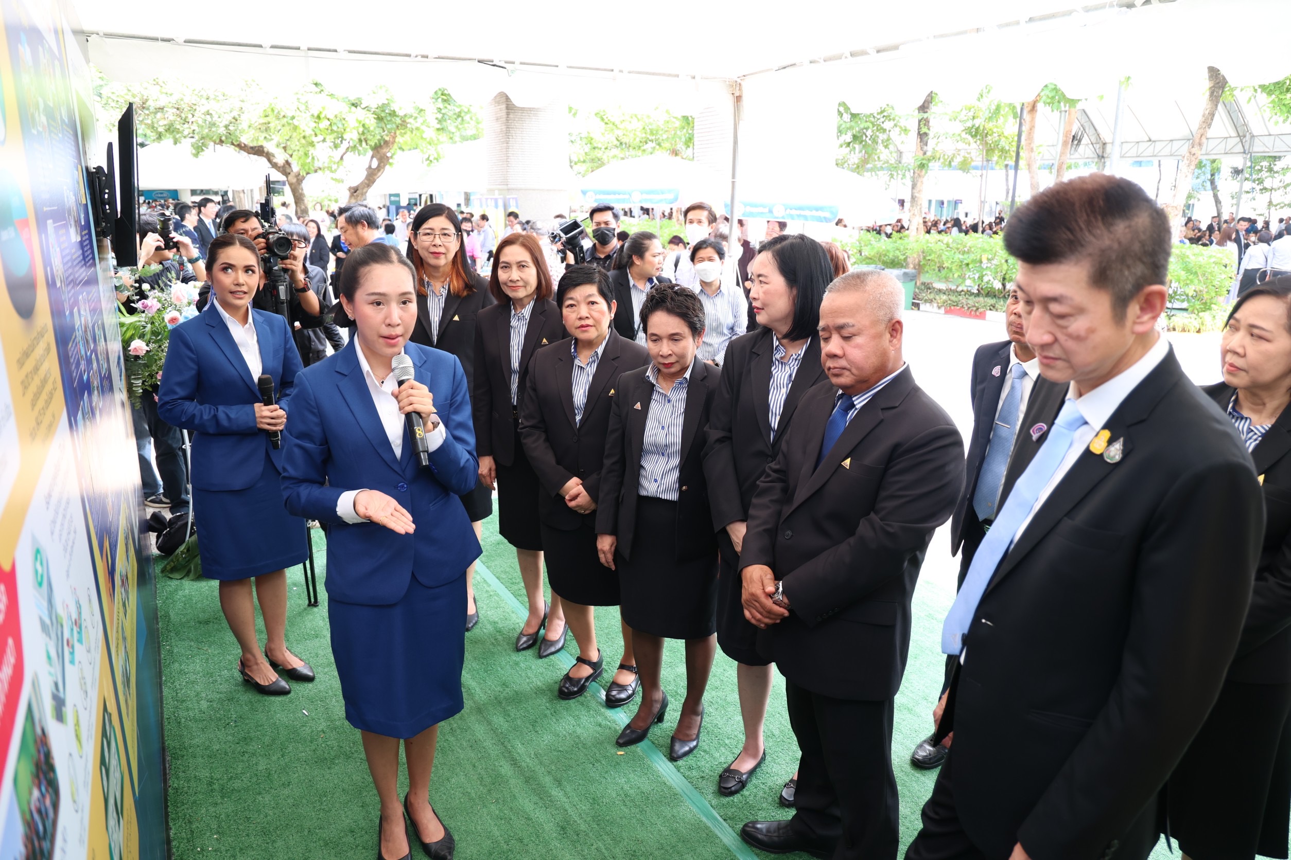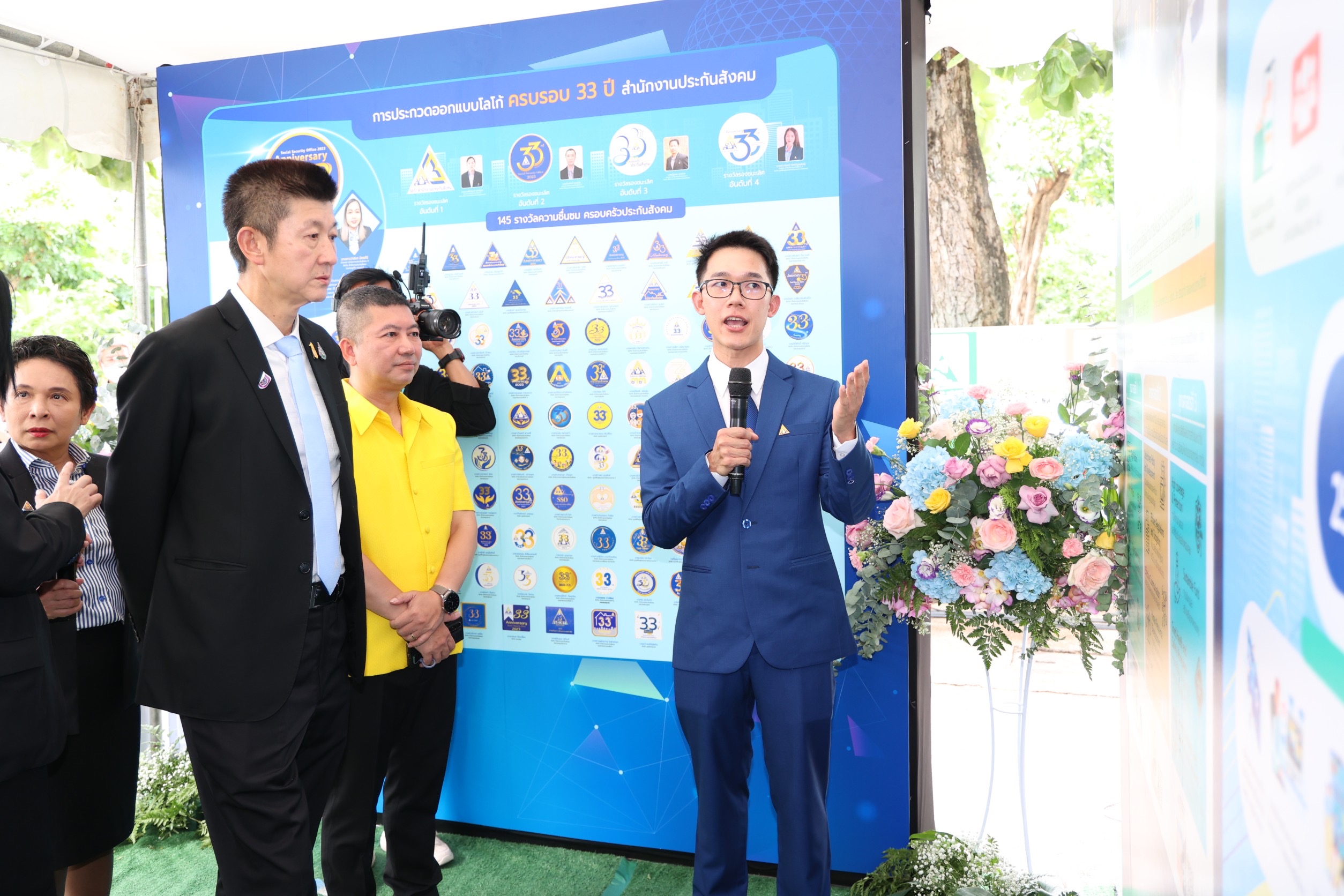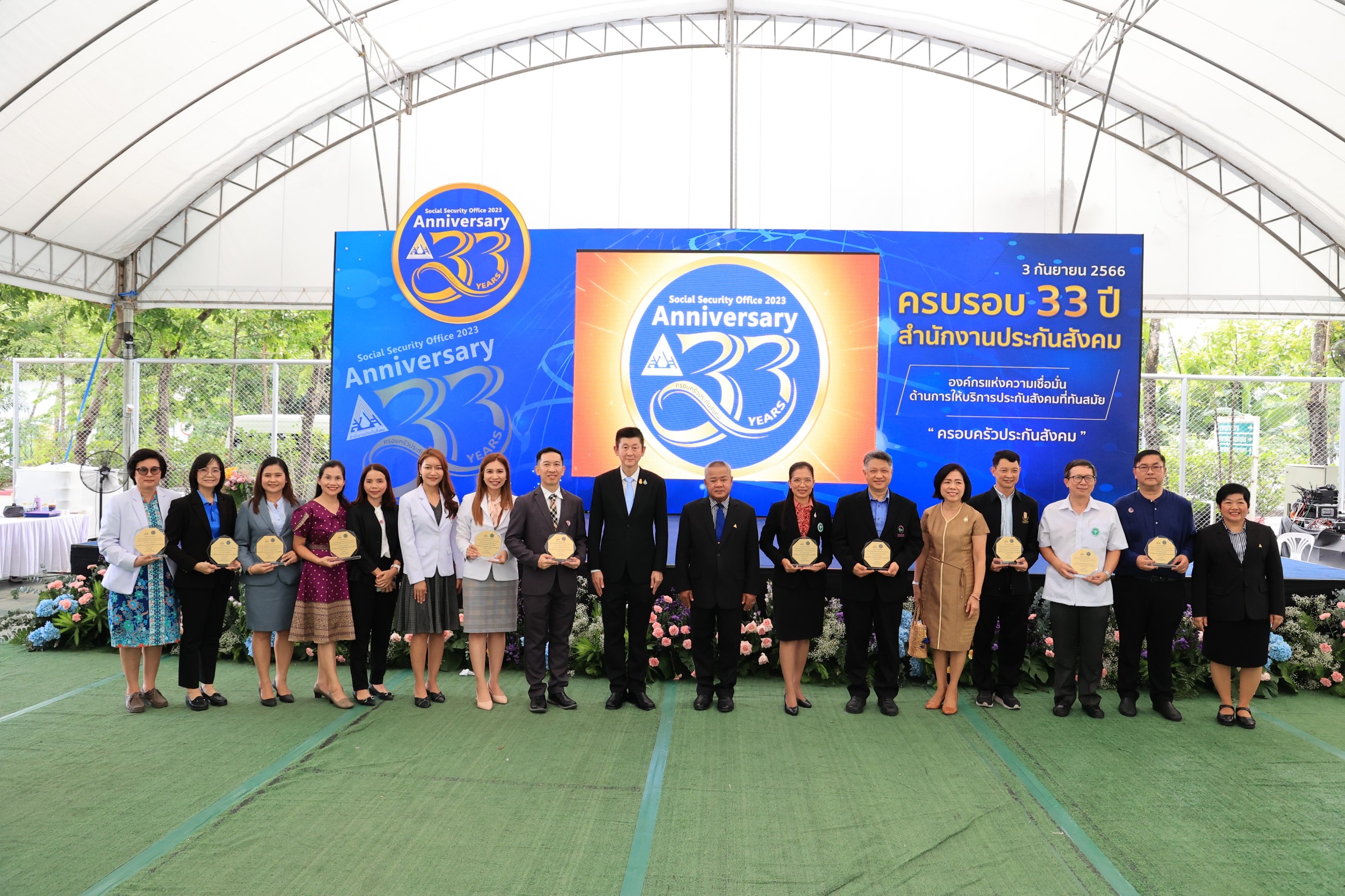 On the morning of the event, the participants paid homage to the sacred objects and gods. They participated in a Buddhist chanting ceremony and the “Social Security Family” activity by organizing a ceremony to present certificates of honour, plaques, and souvenirs, totaling 272 awards. The awards consisted of three awards for the Social Security Office being a model organization, 15 awards for outstanding personnel in morals and ethics under the Social Security Office, 16 awards for the Social Security Short Clip Contest, 88 awards for outstanding social security network, and 150 awards for people who had submissions to the logo contest. In addition, there was an exhibition at the event and product display booths, as well as being sold by social security network members. There were displays from OTOP product booths, hospital booths providing influenza vaccinations, work displays, and products sold by people undergoing rehabilitation from five worker rehabilitation centers. In the afternoon, there was an opening ceremony for the Social Security Office’s 33rd anniversary and a plaque presentation ceremony. There were 165 awards, consisting of 45 for those who contributed to the Social Security Office in 3 areas: 1) Promoting and supporting social security operations. 2) Promoting health and preventing disease, and 3) Promoting workplace safety or rehabilitation. There were 22 favourite hospital awards, 56 outstanding establishment awards, and 42 workplace safety promotion and prevention awards from the Compensation Fund.