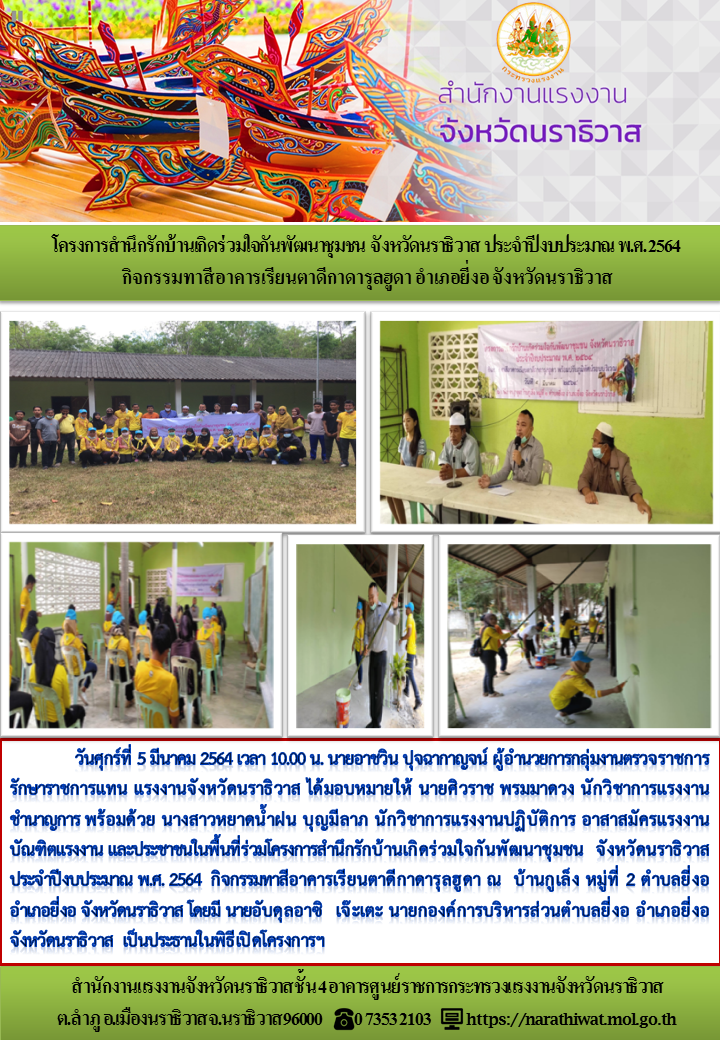 สำนักงานเเรงงานจังหวัดนราธิวาส โครงการสำนึกรักบ้านเกิดร่วมใจกันพัฒนาชุมชนจังหวัดนราธิวาส ประจำปีงบประมาณ พ.ศ. 2564 กิจกรรมทาสีอาคารเรียนตาดีกาดารุลฮูดา อำเภอยี่งอ จังหวัดนราธิวาส