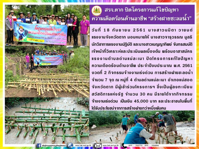 สำนักงานแรงงานจังหวัดตาก ปิดโครงการแก้ไขปัญหาความเดือดร้อนด้านอาชีพ "การสร้างฝายชะลอน้ำ"