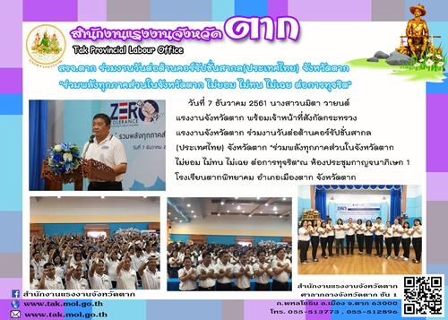 สำนักงานแรงงานจังหวัดตาก ร่วมงานวันต่อต้านคอร์รัปชั่นสากล (ประเทศไทย) จังหวัดตาก "ร่วมพลังทุกภาคส่วนในจังหวัดตาก ไม่ยอม ไม่ทน ไม่เฉย ต่อการทุจริต"