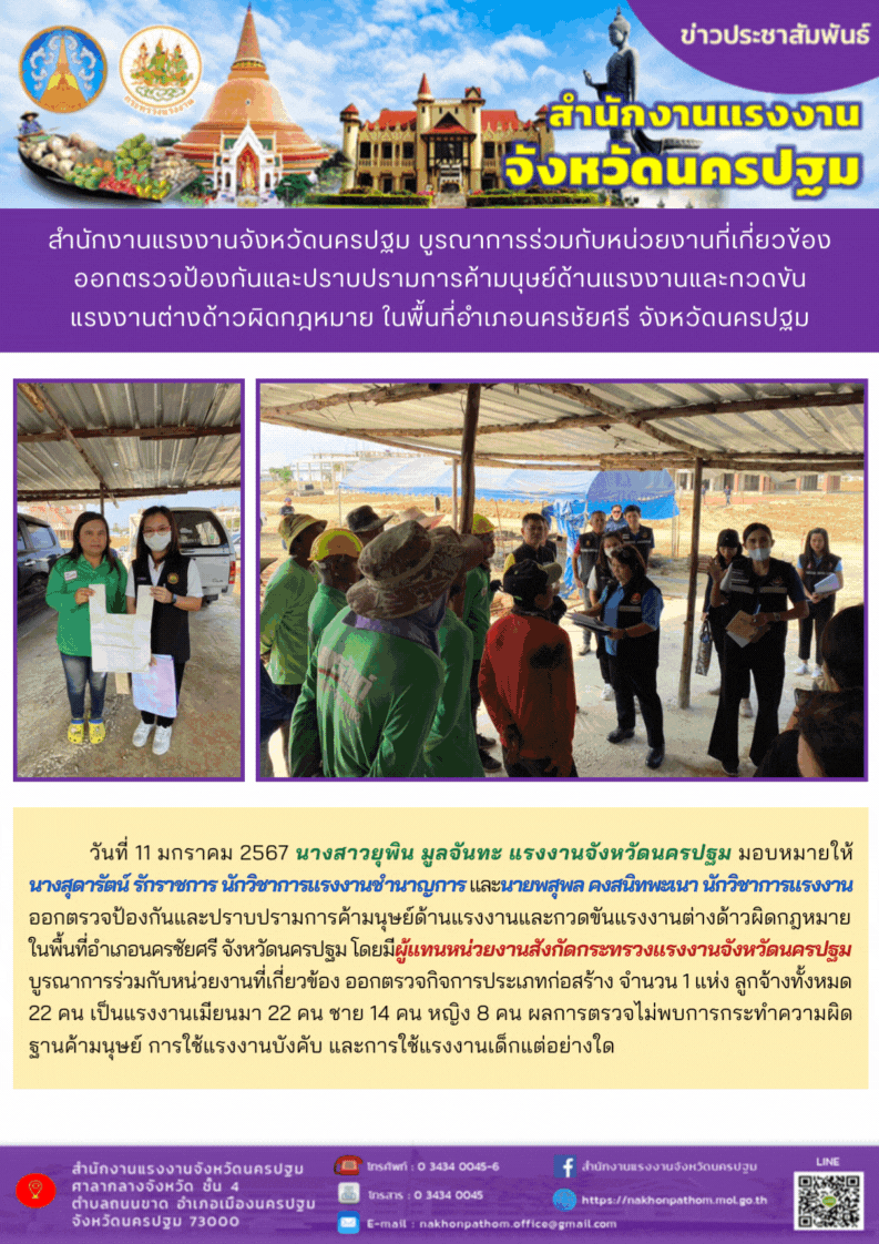 สรจ.นครปฐม บูรณาการร่วมกับหน่วยงานที่เกี่ยวข้องออกตรวจป้องกันและปราบปรามการค้ามนุษย์ด้านแรงงานและกวดขันแรงงานต่างด้าวผิดกฎหมาย ในพื้นที่อำเภอนครชัยศรี จังหวัดนครปฐม