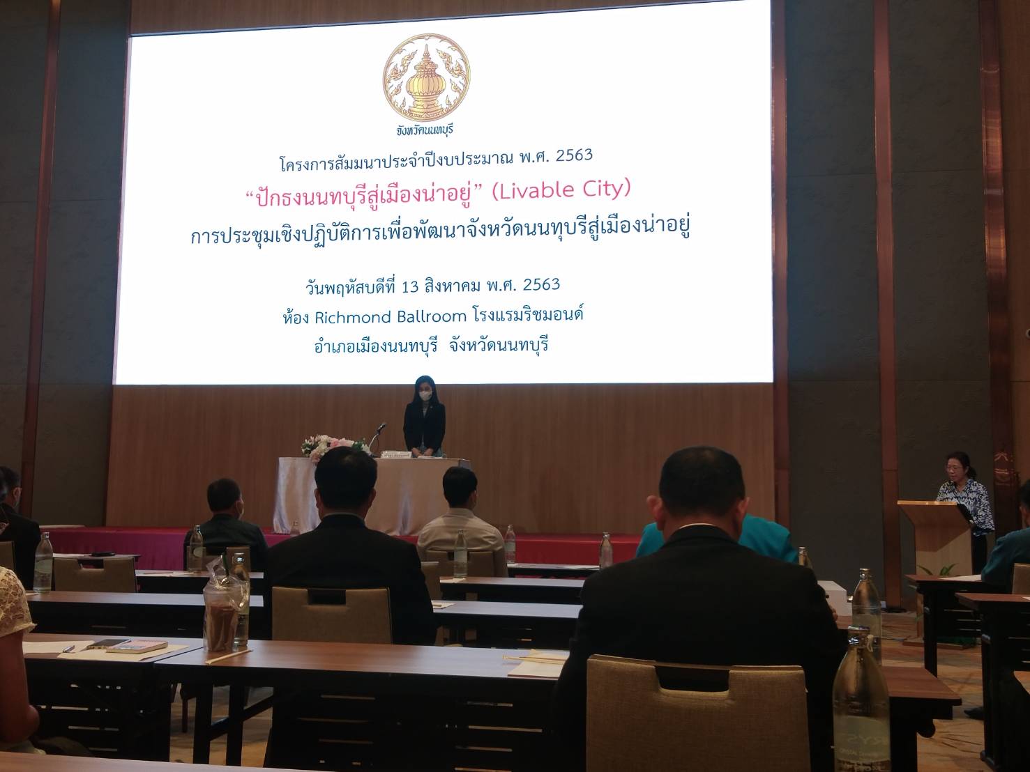 วันที่ 13 สิงหาคม 2563 เวลา 09.00 น. นางสาวพรวิไล ผ่องศรี นักวิชาการแรงงานชำนาญการ ได้รับมอบหมายจากแรงงานจังหวัดนนทบุรี เข้าร่วมโครงการสัมมนาประจำปีงบประมาณ พ.ศ. 2563 “ปักธงนนทบุรีสู่เมืองน่าอยู่ (Livable City)” โดยมีวัตถุประสงค์เพื่อให้การขับเคลื่อนวิสัยทัศน์ให้ไปสู่เป้าหมายการพัฒนาที่กำหนด ในกิจกรรมที่ 2 การประชุมเชิงปฏิบัติการเพื่อพัฒนาจังหวัดนนทบุรีสู่เมืองน่าอยู่ ณ ห้อง Rochmond Ballroom โรงแรมริชมอนด์ จังหวัดนนทบุรี โดยมีนางสาวอโรชา นันทมนตรี รองผู้ว่าราชการจังหวัดนนทบุรี เป็นประธานในการประชุม