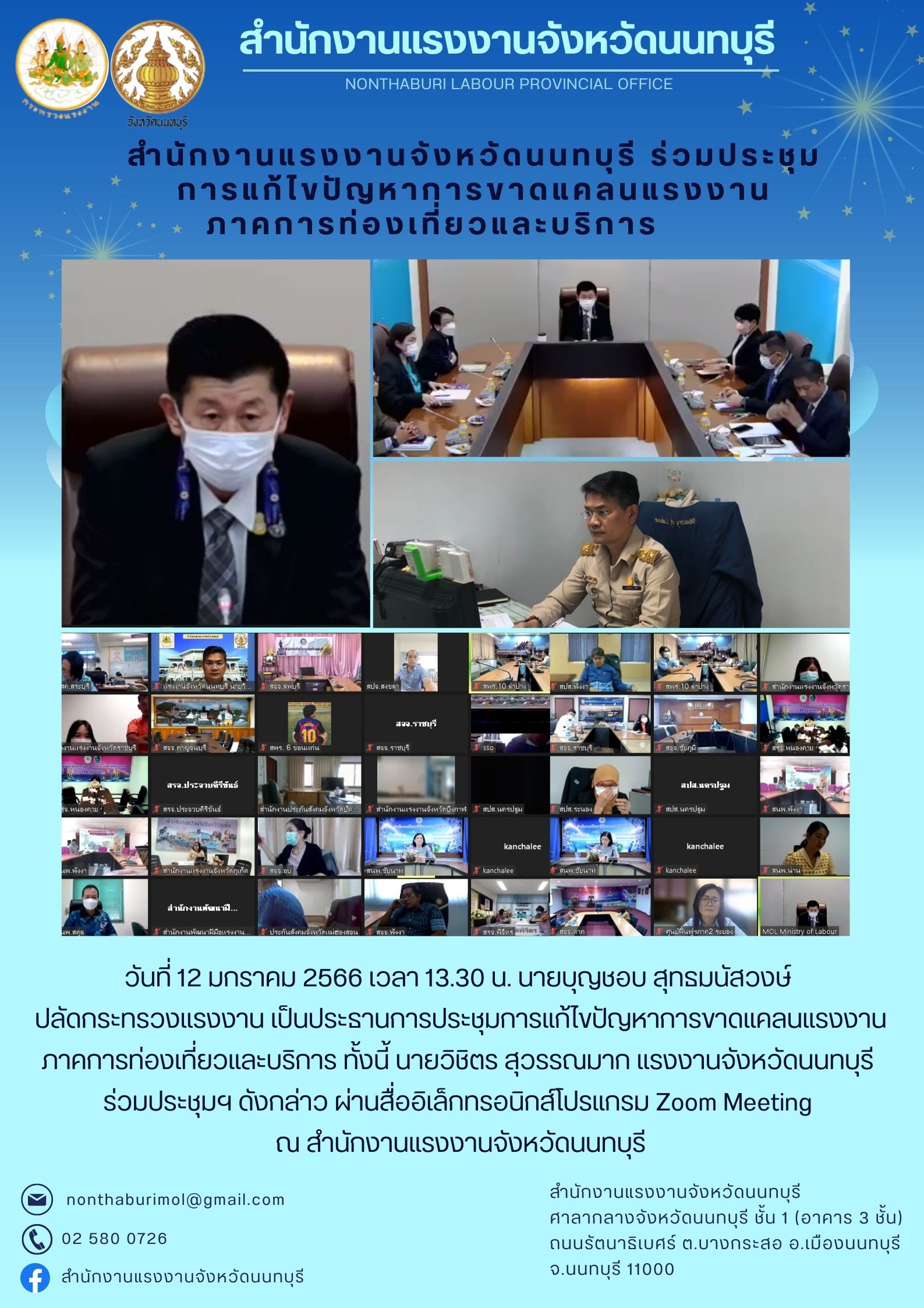วันที่ 12มกราคม 2566 เวลา 13.30 น. นายบุญชอบ สุทธมนัสวงษ์ ปลัดกระทรวงแรงงาน เป็นประธานการประชุมการแก้ไขปัญหาการขาดแคลนแรงงานภาคการท่องเที่ยวและบริการ ทั้งนี้ นายวิชิตร สุวรรณมาก แรงงานจังหวัดนนทบุรีร่วมประชุมฯ ดังกล่าว ผ่านสื่ออิเล็กทรอนิกส์โปรแกรม Zoom Meeting ณ สำนักงานแรงงานจังหวัดนนทบุรี