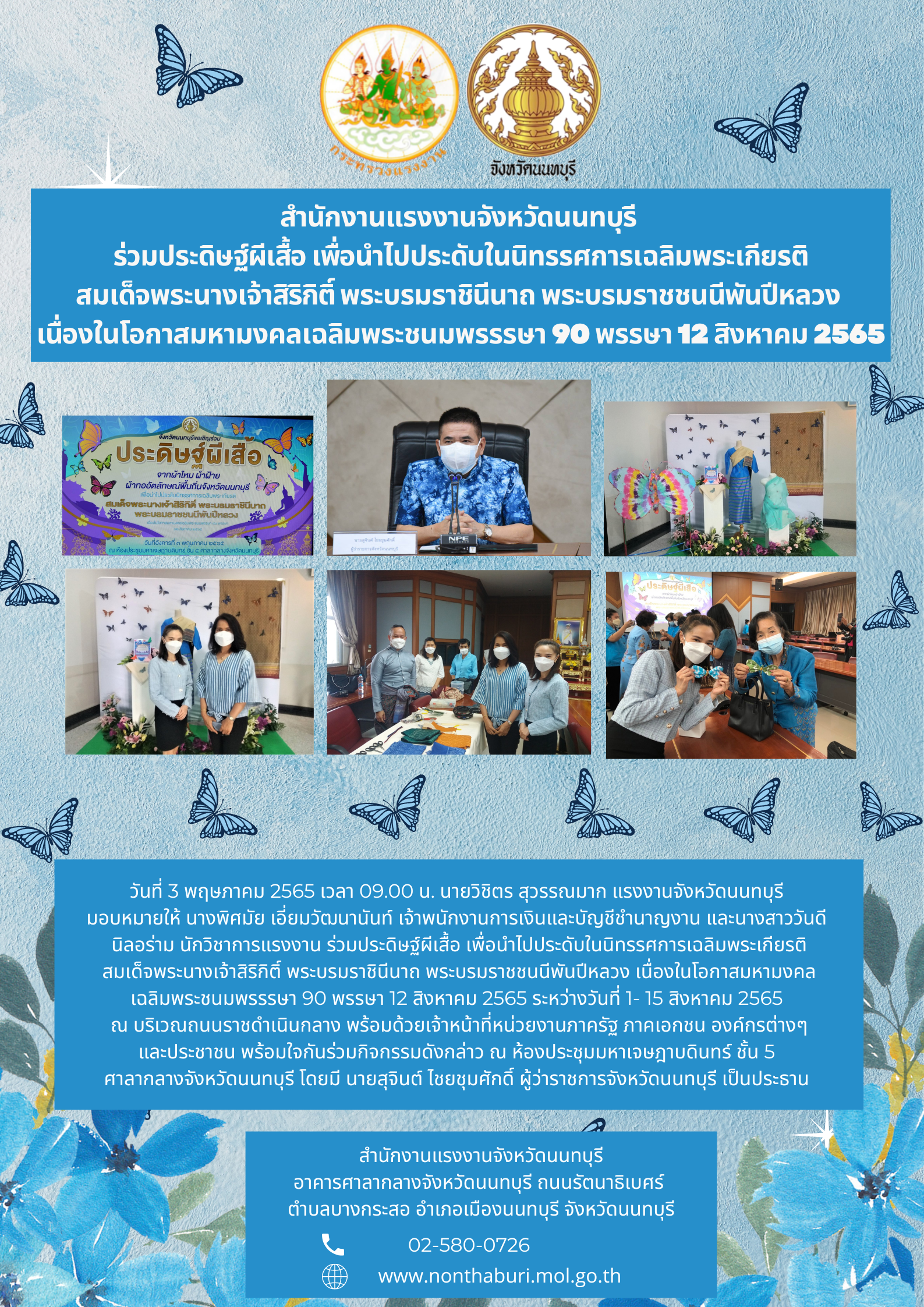 วันที่ 3 พฤษภาคม 2565 เวลา 09.00 น. นายวิชิตร สุวรรณมาก แรงงานจังหวัดนนทบุรี มอบหมายให้ นางพิศมัย เอี่ยมวัฒนานันท์ เจ้าพนักงานการเงินและบัญชีชำนาญงาน และนางสาววันดี นิลอร่าม นักวิชาการแรงงาน ร่วมประดิษฐ์ผีเสื้อ เพื่อนำไปประดับในนิทรรศการเฉลิมพระเกียรติ สมเด็จพระนางเจ้าสิริกิติ์ พระบรมราชินีนาถ พระบรมราชชนนีพันปีหลวง เนื่องในโอกาสมหามงคลเฉลิมพระชนมพรรรษา 90 พรรษา 12 สิงหาคม 2565 ระหว่างวันที่ 1- 15 สิงหาคม 2565 ณ บริเวณถนนราชดำเนินกลาง พร้อมด้วยเจ้าหน้าที่หน่วยงานภาครัฐ ภาคเอกชน องค์กรต่างๆ และประชาชน พร้อมใจกันร่วมกิจกรรมดังกล่าว ณ ห้องประชุมมหาเจษฎาบดินทร์ ชั้น 5 ศาลากลางจังหวัดนนทบุรี โดยมี นายสุจินต์ ไชยชุมศักดิ์ ผู้ว่าราชการจังหวัดนนทบุรี เป็นประธาน