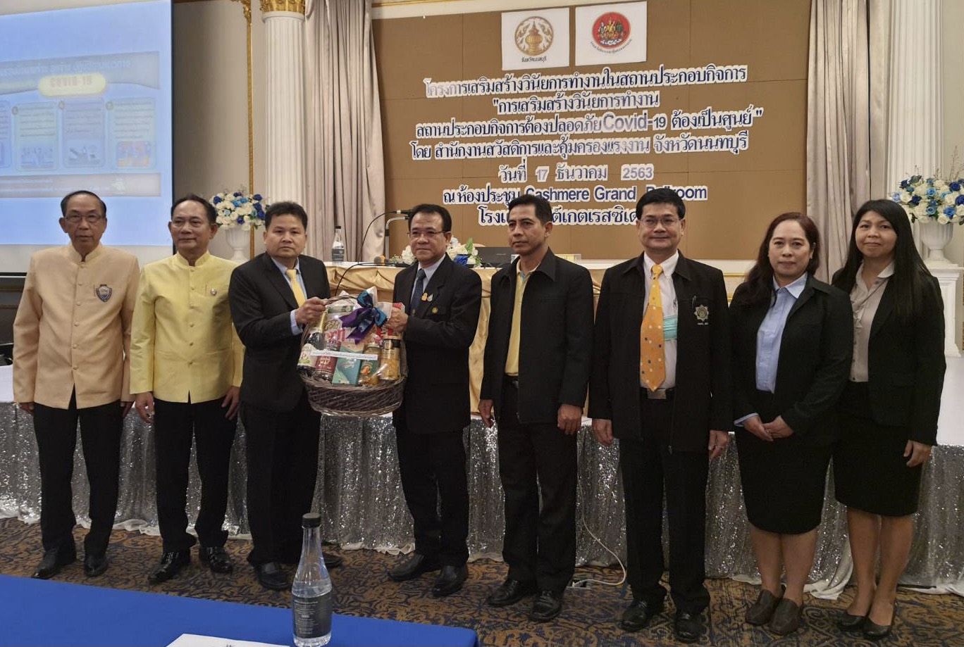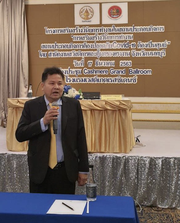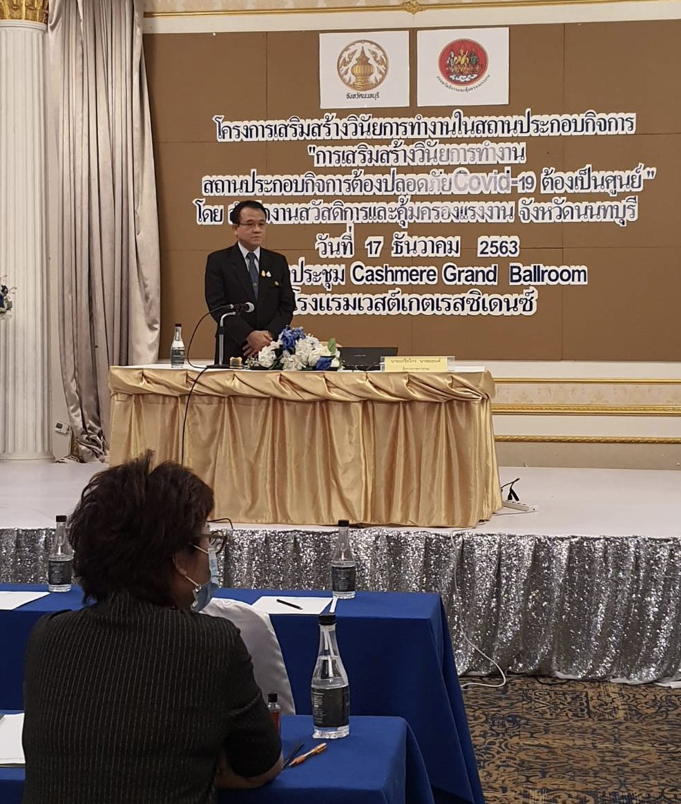 วันที่ 17 ธันวาคม 2563 เลา 09.00 น. นายวิชิตร สุวรรณมาก แรงงานจังหวัดนนทบุรี นายสงกรานต์ เพิ่มฤๅชัย นายอัครินทร์ ธารีฉัตรไพศาล และเจ้าหน้าที่สำนักงานสวัสดิการและคุ้มครองแรงงาน ร่วมพีธีเปิดโครงการการเสริมสร้างวินัยการทำงานในสถานประกอบกิจการ จัดโดยสำนักงานสวัสดิการและคุ้มครองแรงงาน จังหวัดนนทบุรี เพื่อให้สถานประกอบกิจการมีความรู้ ความเข้าใจกฎ ระเบียบ วินัย ความรับผิดชอบในการทำงาน และปฏิบัติตามมาตราการการป้องกันการแพร่ระบาดของเชื้อไวรัสโคโรน่า 2019 อย่างเคร่งครัด ตามแนวทางของกรมสวัสดิการและคุ้มครองแรงงาน โดยมีนายเกริกไกร นาสมยนต์ ผู้ตรวจราชการกรมสวัสดิการและคุ้มครองแรงงานเป็นประธานในพีธีเปิดการอบรมในครั้งนี้