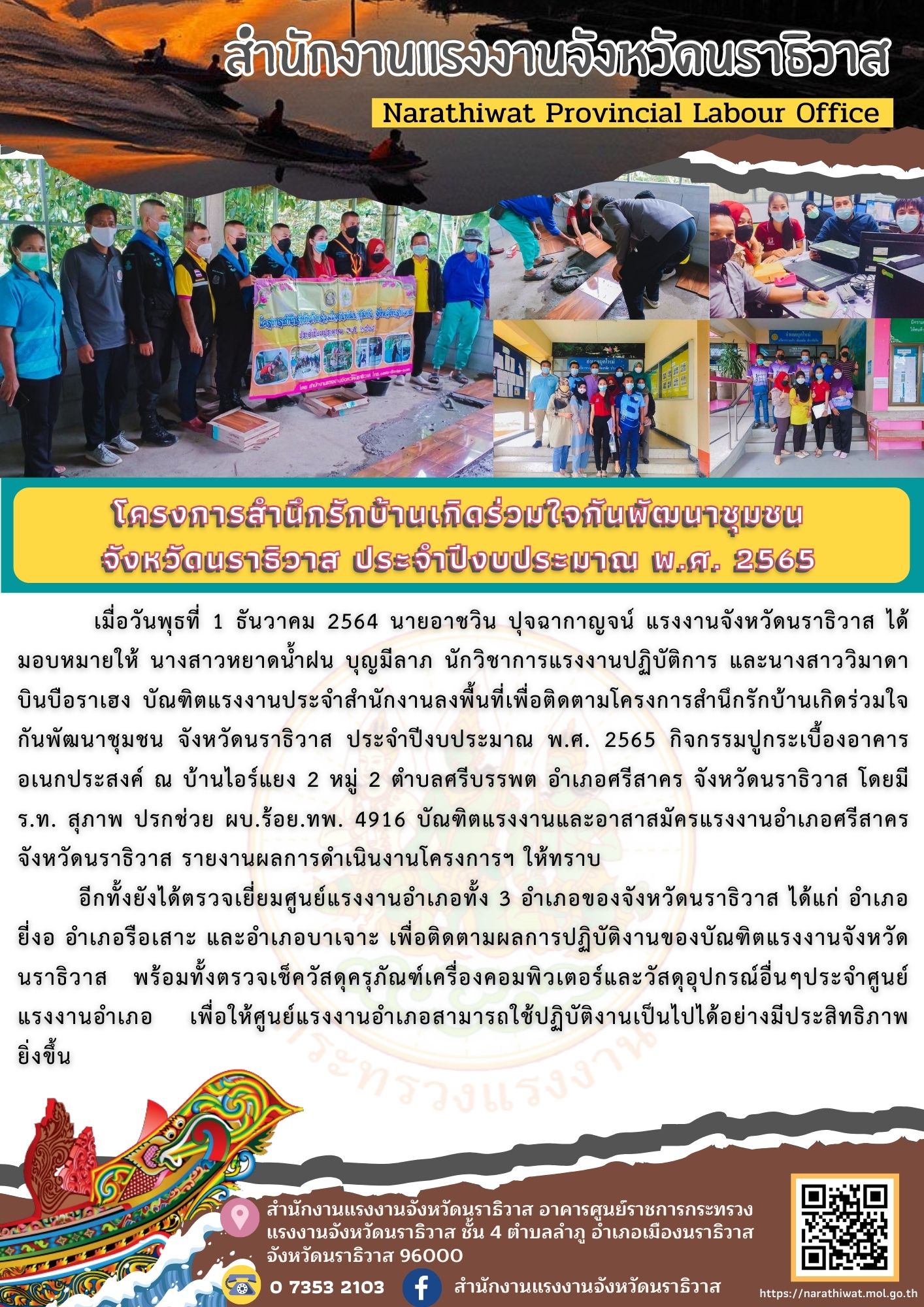 เมื่อวันพุธที่ 1 ธันวาคม 2564 นายอาชวิน ปุจฉากาญจน์ แรงงานจังหวัดนราธิวาส ได้มอบหมายให้ นางสาวหยาดน้ำฝน บุญมีลาภ นักวิชาการแรงงานปฏิบัติการ และนางสาววิมาดา บินบือราเฮง บัณฑิตแรงงานประจำสำนักงาน ลงพื้นที่เพื่อติดตามโครงการสำนึกรักบ้านเกิดร่วมใจกันพัฒนาชุมชน จังหวัดนราธิวาส ประจำปีงบประมาณ พ.ศ. 2565 กิจกรรมปูกระเบื้องอาคารอเนกประสงค์ ณ บ้านไอร์แยง 2 หมู่ 2 ตำบลศรีบรรพต อำเภอศรีสาคร จังหวัดนราธิวาส โดยมี ร.ท. สุภาพ ปรกช่วย ผบ.ร้อย.ทพ. 4916 บัณฑิตแรงงานและอาสาสมัครแรงงานอำเภอศรีสาคร จังหวัดนราธิวาส รายงานผลการดำเนินงานโครงการฯ ให้ทราบ