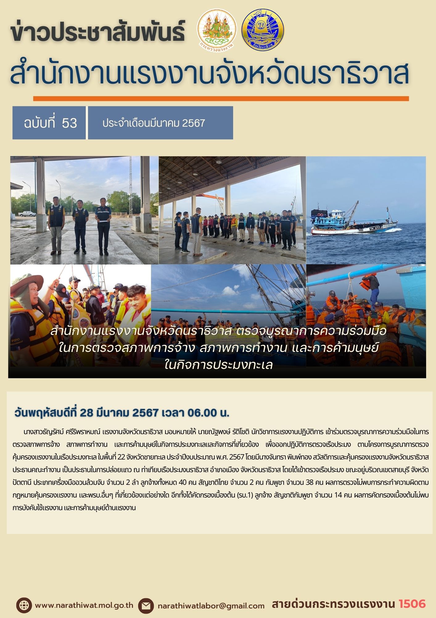 วันพฤหัสบดีที่ 28 มีนาคม 2567 เวลา 06.00 น. นางสาวธัญรัศม์ ศรีริพราหมณ์ แรงงานจังหวัดนราธิวาส มอบหมายให้ นายณัฐพงษ์ รัติโชติ นักวิชาการแรงงานปฏิบัติการ เข้าร่วมตรวจบูรณาการความร่วมมือในการตรวจสภาพการจ้าง สภาพการทำงาน และการค้ามนุษย์ในกิจการประมงทะเลและกิจการที่เกี่ยวข้อง เพื่อออกปฏิบัติการตรวจเรือประมง ตามโครงการบูรณาการตรวจคุ้มครองแรงงานในเรือประมงทะเล ในพื้นที่ 22 จังหวัดชายทะเล ประจำปีงบประมาณ พ.ศ. 2567 โดยมีนางจันทรา พิมพ์ทอง สวัสดิการและคุ้มครองแรงงานจังหวัดนราธิวาส ประธานคณะทำงาน เป็นประธานในการปล่อยแถว ณ ท่าเทียบเรือประมงนราธิวาส อำเภอเมือง จังหวัดนราธิวาส โดยได้เข้าตรวจเรือประมง ขณะอยู่บริเวณเขตสายบุรี จังหวัดปัตตานี ประเภทเครื่องมืออวนล้วมจับ จำนวน 2 ลำ ลูกจ้างทั้งหมด 40 คน สัญชาติไทย จำนวน 2 คน กัมพูชา จำนวน 38 คน ผลการตรวจไม่พบการกระทำความผิดตามกฎหมายคุ้มครองแรงงาน และ พ.ร.บ. อื่น ๆ ที่เกี่ยวข้องแต่อย่างใด อีกทั้งได้คัดกรองเบื้องต้น (รบ.1) ลูกจ้าง สัญชาติกัมพูชา จำนวน 14 คน ผลการคัดกรองเบื้องต้นไม่พบการบังคับใช้แรงงาน และการค้ามนุษย์ด้านแรงงาน