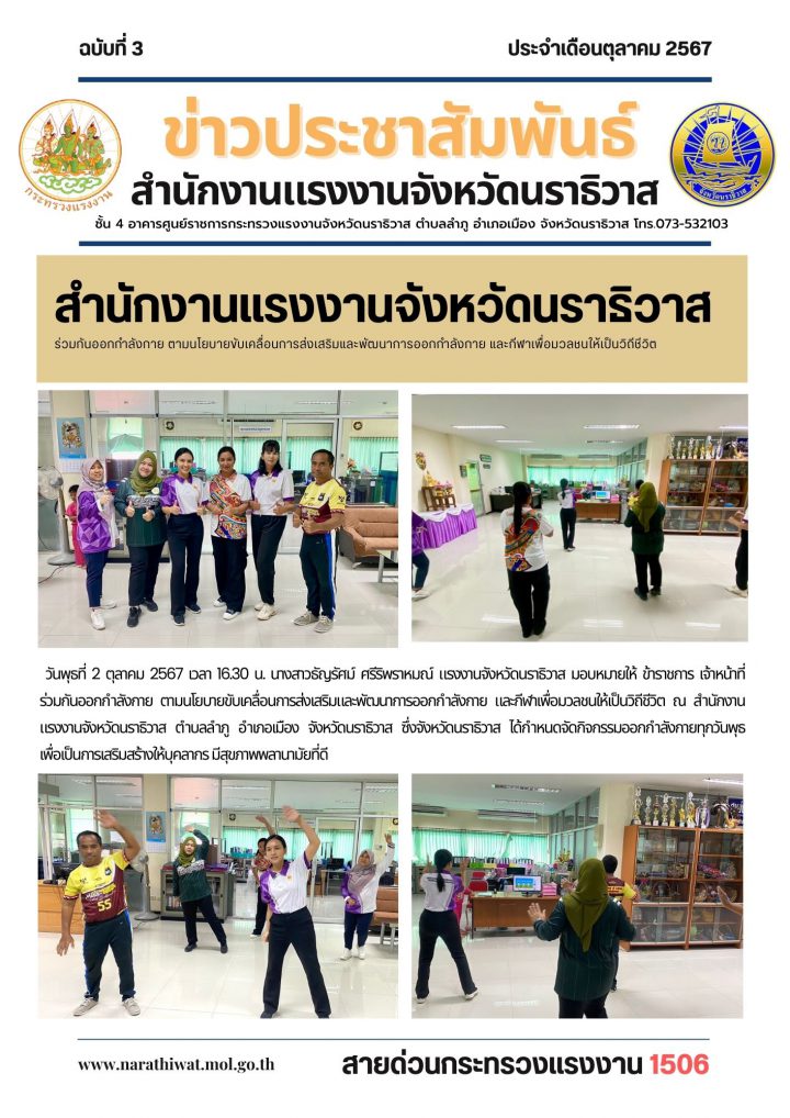 วันพุธที่ 2 ตุลาคม 2567 เวลา 16.30 น. นางสาวธัญรัศม์ ศรีริพราหมณ์ แรงงานจังหวัดนราธิวาส มอบหมายให้ ข้าราชการ เจ้าหน้าที่ ร่วมกันออกกำลังกาย ตามนโยบายขับเคลื่อนการส่งเสริมและพัฒนาการออกกำลังกาย และกีฬาเพื่อมวลชนให้เป็นวิถีชีวิต ณ สำนักงานแรงงานจังหวัดนราธิวาส ตำบลลำภู อำเภอเมือง จังหวัดนราธิวาส ซึ่งจังหวัดนราธิวาส ได้กำหนดจัดกิจกรรมออกกำลังกายทุกวันพุธ เพื่อเป็นการเสริมสร้างให้บุคลากร มีสุขภาพพลานามัยที่ดี