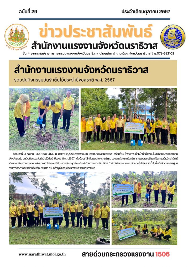 วันจันทร์ที่ 21 ตุลาคม 2567 เวลา 08.30 น. นางสาวธัญรัศม์ ศรีริพราหมณ์ แรงงานจังหวัดนราธิวาส พร้อมด้วย ข้าราชการ เจ้าหน้าที่หน่วยงานในสังกัดกระทรวงแรงงานจังหวัดนราธิวาส ร่วมกิจกรรมวันรักต้นไม้ประจำปีของชาติ พ.ศ.2567 เพื่อน้อมรำลึกถึงพระมหากรุณาธิคุณ ของสมเด็จพระศรีนครินทราบรมราชชนนี และเป็นการสร้างจิตสำนึกให้เกิดความรัก ความหวงแหนทรัพยากรป่าไม้ของชาติ โดยร่วมกันบำรุงรักษาตันไม้ ด้วยการพรวนดิน ใส่ปุ๋ย กำจัดวัชพืช โรค แมลง ตัดแต่งกิ่งไม้ และรดนํ้าในพื้นที่บริเวณอาคารศูนย์ราชการกระทรวงแรงงานจังหวัดนราธิวาส ตำบลลำภู อำเภอเมืองนราธิวาส จังหวัดนราธิวาส