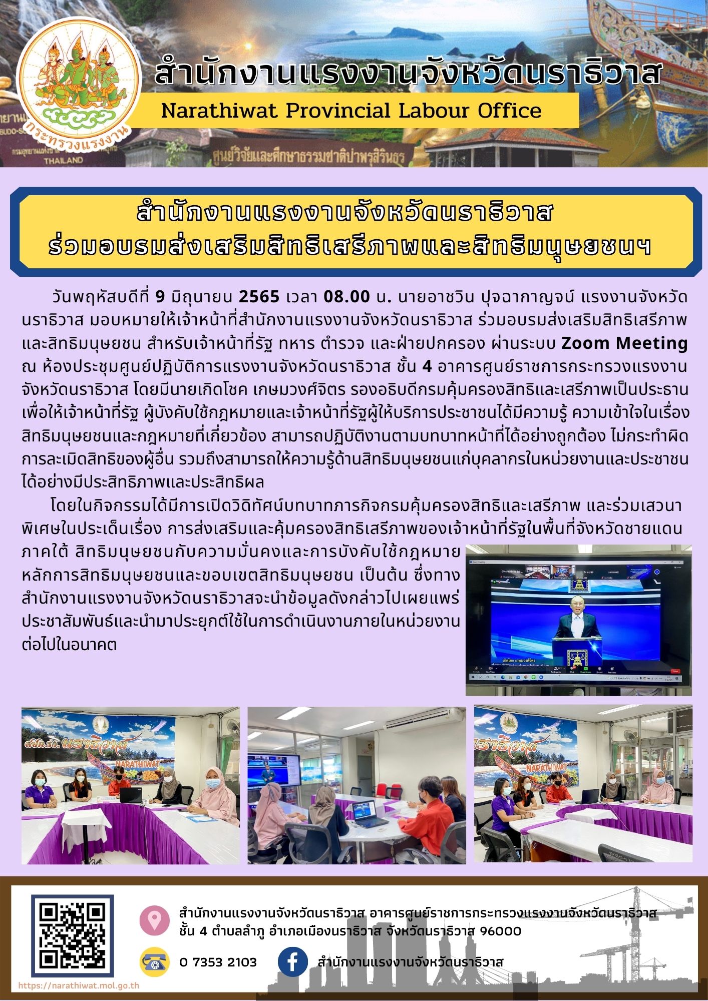 วันพฤหัสบดีที่ 9 มิถุนายน 2565 เวลา 08.00 น. นายอาชวิน ปุจฉากาญจน์ แรงงานจังหวัดนราธิวาส มอบหมายให้เจ้าหน้าที่สำนักงานแรงงานจังหวัดนราธิวาส ร่วมอบรมส่งเสริมสิทธิเสรีภาพและสิทธิมนุษยชน สำหรับเจ้าหน้าที่รัฐ ทหาร ตำรวจ และฝ่ายปกครอง ผ่านระบบ Zoom Meeting ณ ห้องประชุมศูนย์ปฏิบัติการแรงงานจังหวัดนราธิวาส ชั้น 4 อาคารศูนย์ราชการกระทรวงแรงงานจังหวัดนราธิวาส โดยมีนายเกิดโชค เกษมวงศ์จิตร รองอธิบดีกรมคุ้มครองสิทธิและเสรีภาพเป็นประธาน เพื่อให้เจ้าหน้าที่รัฐ ผู้บังคับใช้กฎหมายและเจ้าหน้าที่รัฐผู้ให้บริการประชาชนได้มีความรู้ ความเข้าใจในเรื่องสิทธิมนุษยชนและกฎหมายที่เกี่ยวข้อง สามารถปฏิบัติงานตามบทบาทหน้าที่ได้อย่างถูกต้อง ไม่กระทำผิดการละเมิดสิทธิของผู้อื่น รวมถึงสามารถให้ความรู้ด้านสิทธิมนุษยชนแก่บุคลากรในหน่วยงานและประชาชนได้อย่างมีประสิทธิภาพและประสิทธิผล