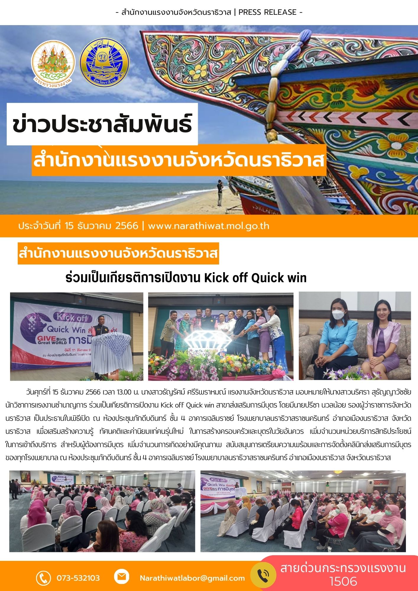 วันศุกร์ที่ 15 ธันวาคม 2566 เวลา 13.00 น. นางสาวธัญรัศม์ ศรีริพราหมณ์ แรงงานจังหวัดนราธิวาส มอบหมายให้นางสาวนริศรา สุธัญญาวัชชัย นักวิชาการแรงงานชำนาญการ ร่วมเป็นเกียรติการเปิดงาน Kick off Quick win สาขาส่งเสริมการมีบุตร โดยมีนายปรีชา นวลน้อย รองผู้ว่าราชการจังหวัดนราธิวาส เป็นประธานในพิธีเปิด ณ ห้องประชุมภักดีบดินทร์ ชั้น 4 อาคารเฉลิมราชย์ โรงพยาบาลนราธิวาสราชนครินทร์ อำเภอเมืองนราธิวาส จังหวัดนราธิวาส เพื่อเสริมสร้างความรู้ ทัศนคติและค่านิยมแก่คนรุ่นใหม่ ในการสร้างครอบครัวและบุตรในวัยอันควร เพิ่มจำนวนหน่วยบริการสิทธิประโยชน์ ในการเข้าถึงบริการ สำหรับผู้ต้องการมีบุตร เพิ่มจำนวนการเกิดอย่างมีคุณภาพ สนับสนุนการเตรียมความพร้อมและการจัดตั้งคลินิกส่งเสริมการมีบุตรของทุกโรงพยาบาล ณ ห้องประชุมภักดีบดินทร์ ชั้น 4 อาคารเฉลิมราชย์ โรงพยาบาลนราธิวาสราชนครินทร์ อำเภอเมืองนราธิวาส จังหวัดนราธิวาส