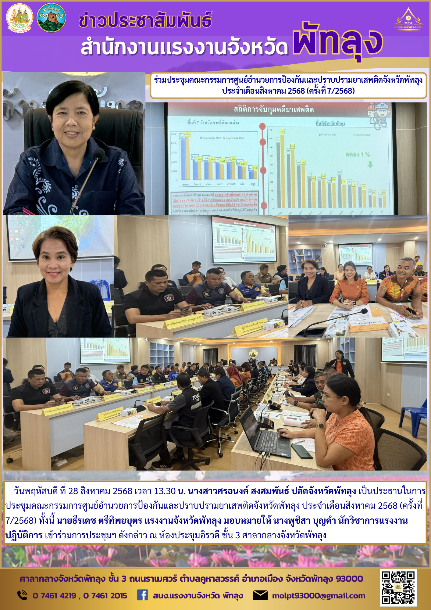 วันพฤหัสบดี ที่ 28 สิงหาคม 2568 เวลา 13.30 น. นางสาวศรอนงค์ สงสมพันธ์ ปลัดจังหวัดพัทลุง เป็นประธานในการประชุมคณะกรรมการศูนย์อำนวยการป้องกันและปราบปรามยาเสพติดจังหวัดพัทลุง ประจำเดือนสิงหาคม 2568 (ครั้งที่ 7/2568) ทั้งนี้ นายธีรเดช ตรีทิพยบุตร แรงงานจังหวัดพัทลุง มอบหมายให้ นางพูชิสา บุญดำ นักวิชาการแรงงานปฏิบัติการ เข้าร่วมการประชุมฯ ดังกล่าว ณ ห้องประชุมอิรวดี ชั้น 3 ศาลากลางจังหวัดพัทลุง