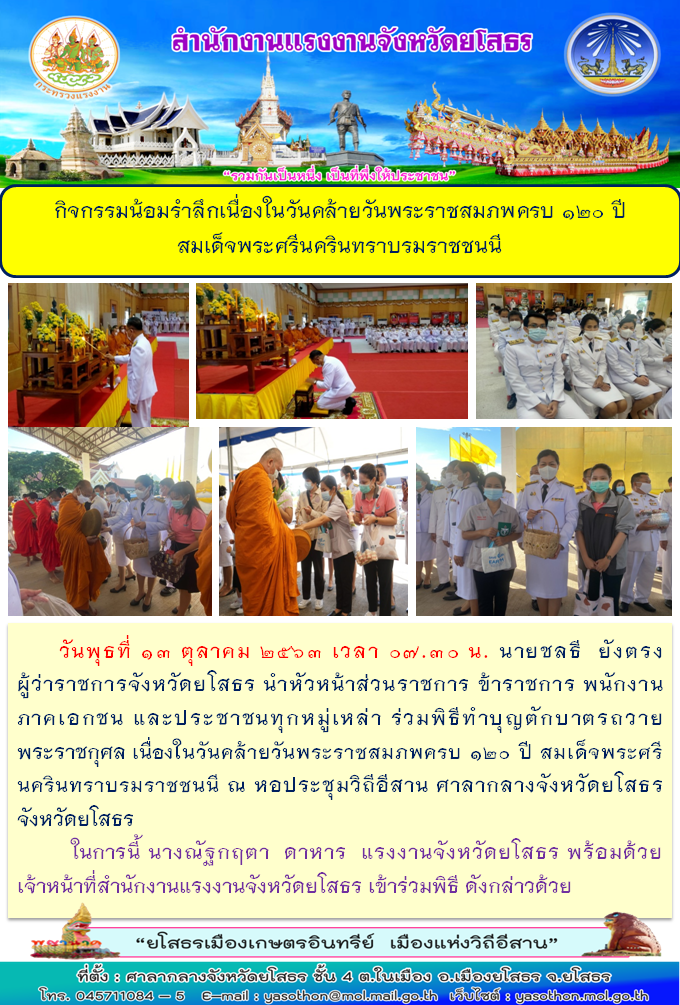 สำนักงานแรงงานจังหวัดยโสธร ร่วมกิจกรรมทำบุญตักบาตรถวายพระราชกุศล เนื่องในวันคล้ายวันพระราชสมภพครบ 120 ปี สมเด็จพระศรีนครินทราบรมราชชนนี