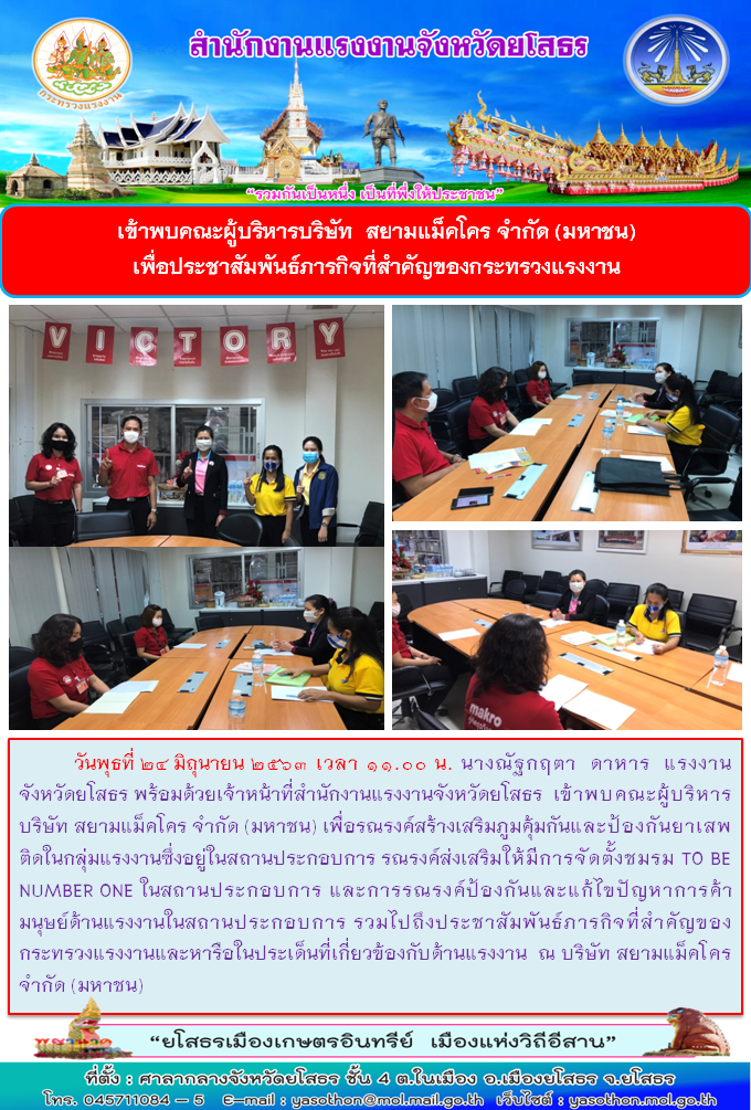 สำนักงานแรงงานจังหวัดยโสธร เข้าพบคณะผู้บริหารบริษัท สยามแม็คโคร จำกัด (มหาชน) เพื่อประชาสัมพันธ์ภารกิจที่สำคัญของกระทรวงแรงงาน