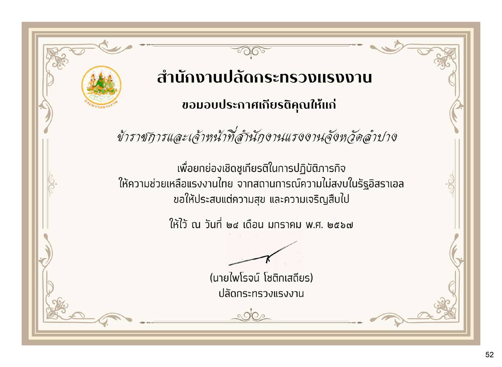 สำนักงานแรงงานจังหวัดลำปาง รับใบประกาศเกียรติคุณ
