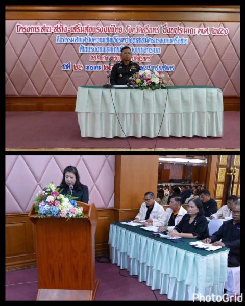 วันที่ 26 มกราคม 2560 สำนักงานแรงงานจังหวัดสุรินทร์จัดอบรมสัมมนาตามโครงการสาน-สร้าง-เสริมสุขแรงงานไทยจังหวัดสุรินทร์ ปี พ.ศ. 2560 กิจกรรมสานสร้างความเข้มแข็งระหว่างอาสาสมัครแรงงาน เครือข่ายด้านแรงงานและแกนนำแรงงานนอกระบบ โดยมีหัวหน้าส่วนสังกัดกระทรวงแรงงาน คณะอนุกรรมการบริหารจัดการแรงงานนอกระบบจังหวัดสุรินทร์ เครือข่ายแรงงานนอกระบบ อาสาสมัครแรงงานจังหวัดสุรินทร์ เข้าร่วมกิจกรรม จำนวน 180 คน โดยมี พ.อ.เอกภาพ สุหร่าย รอง ผอ.กองอำนวยการ กอ.รมน.จังหวัดสุรินทร์ เป็นประธานเปิดโครงการ