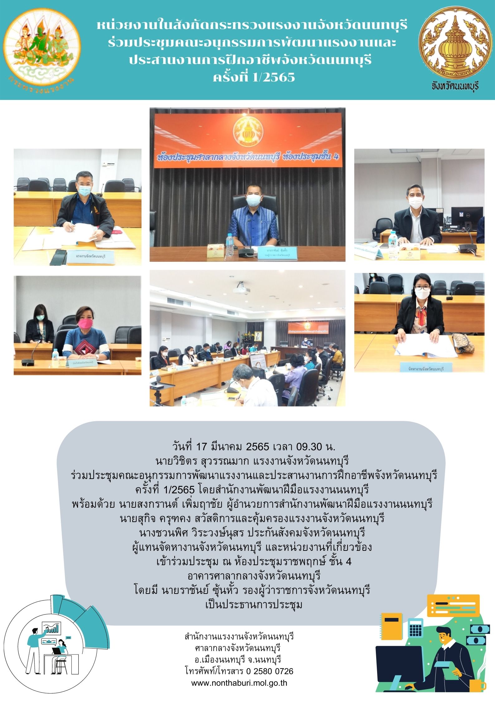 วันที่ 17 มีนาคม 2565 เวลา 09.30 น.นายวิชิตร สุวรรณมาก แรงงานจังหวัดนนทบุรี ร่วมประชุมคณะอนุกรรมการพัฒนาแรงงานและประสานงานการฝึกอาชีพจังหวัดนนทบุรี ครั้งที่ 1/2565 โดยสำนักงานพัฒนาฝีมือแรงงานนนทบุรี พร้อมด้วย นายสงกรานต์ เพิ่มฤาชัยผู้อำนวยการสำนักงานพัฒนาฝีมือแรงงานนนทบุรี นายสุกิจ ครุฑคงสวัสดิการและคุ้มครองแรงงานจังหวัดนนทบุรี นางชวนพิศ วิระวงษ์นุสร ประกันสังคมจังหวัดนนทบุรี ผู้แทนจัดหางานจังหวัดนนทบุรี และหน่วยงานที่เกี่ยวข้อง เข้าร่วมประชุม ณ ห้องประชุมราชพฤกษ์ ชั้น 4 อาคารศาลากลางจังหวัดนนทบุรี โดยมี นายราชันย์ ซุ้นหั้ว รองผู้ว่าราชการจังหวัดนนทบุรี เป็นประธานการประชุม