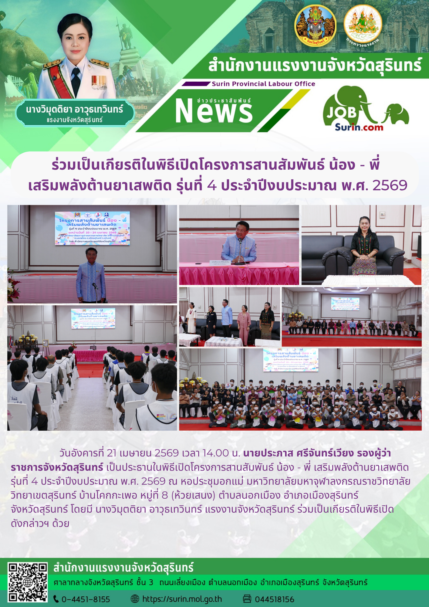 แรงงานจังหวัดสุรินทร์ ร่วมเป็นเกียรติในพิธีเปิดโครงการสานสัมพันธ์ น้อง – พี่ เสริมพลังต้านยาเสพติด รุ่นที่ 4 ประจำปีงบประมาณ พ.ศ. 2569