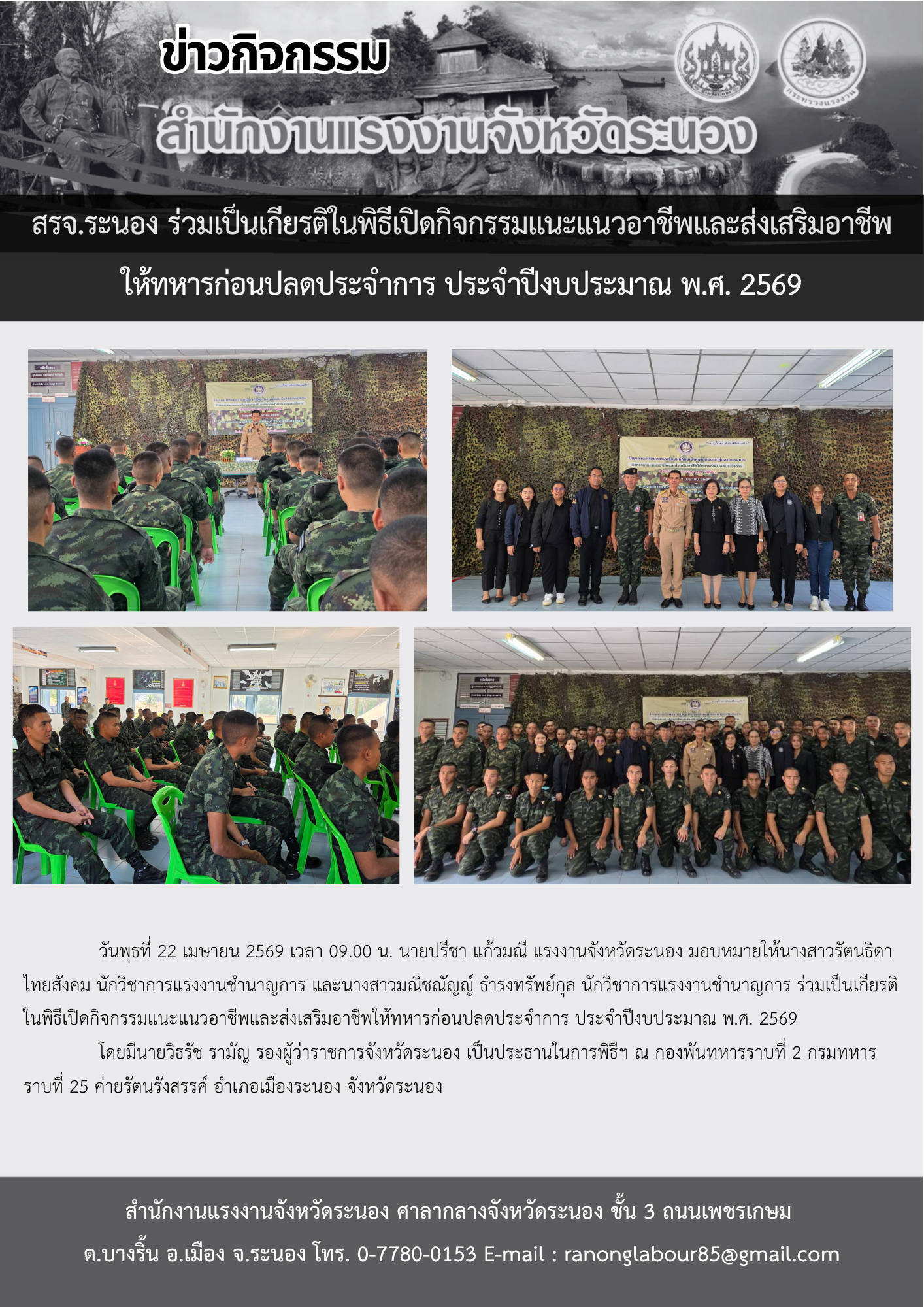 สรจ.ระนอง ร่วมเป็นเกียรติในพิธีเปิดกิจกรรมแนะแนวอาชีพและส่งเสริมอาชีพให้ทหารก่อนปลดประจำการ ประจำปีงบประมาณ พ.ศ. 2569