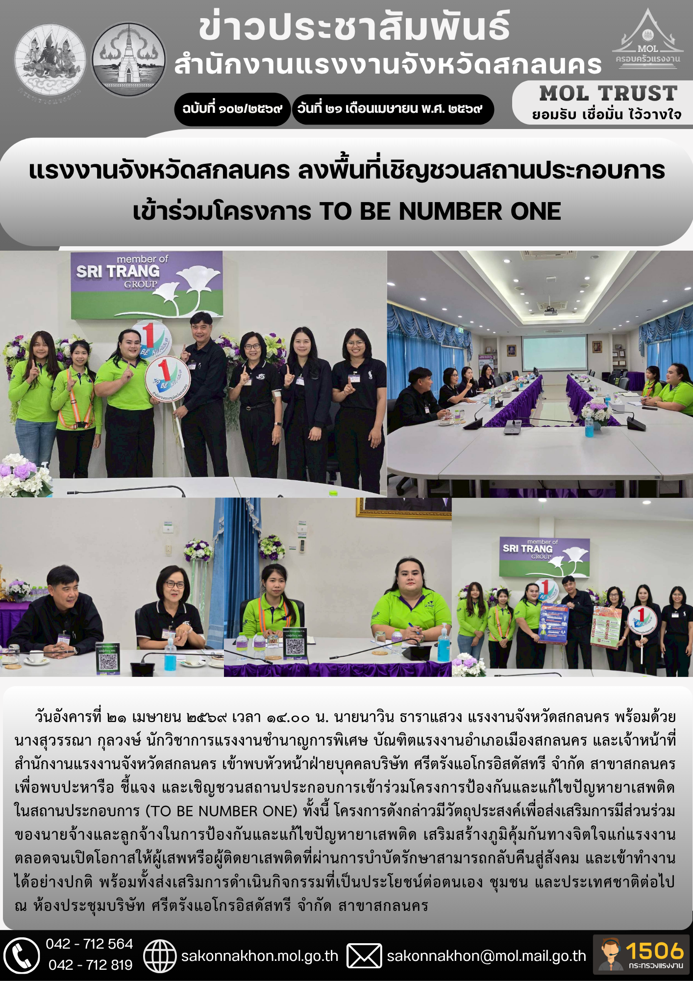 แรงงานจังหวัดสกลนคร ลงพื้นที่เชิญชวนสถานประกอบการ เข้าร่วมโครงการ TO BE NUMBER ONE