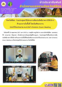 จังหวัดพิจิตร ร่วมประชุมหารือโครงการเพิ่มประสิทธิภาพการให้บริการ ด้านแรงงานในพื้นที่ โดยบัณฑิตแรงงาน ประจำปีงบประมาณ พ.ศ.2567 ผ่านระบบ Zoom Meeting