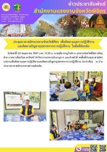 ประชุมอาสาสมัครแรงงานจังหวัดพิจิตร เพื่อติดตามผลการปฏิบัติงาน และติดตามปัญหาอุปสรรคจากการปฏิบัติงาน ในพื้นที่ทับคล้อ