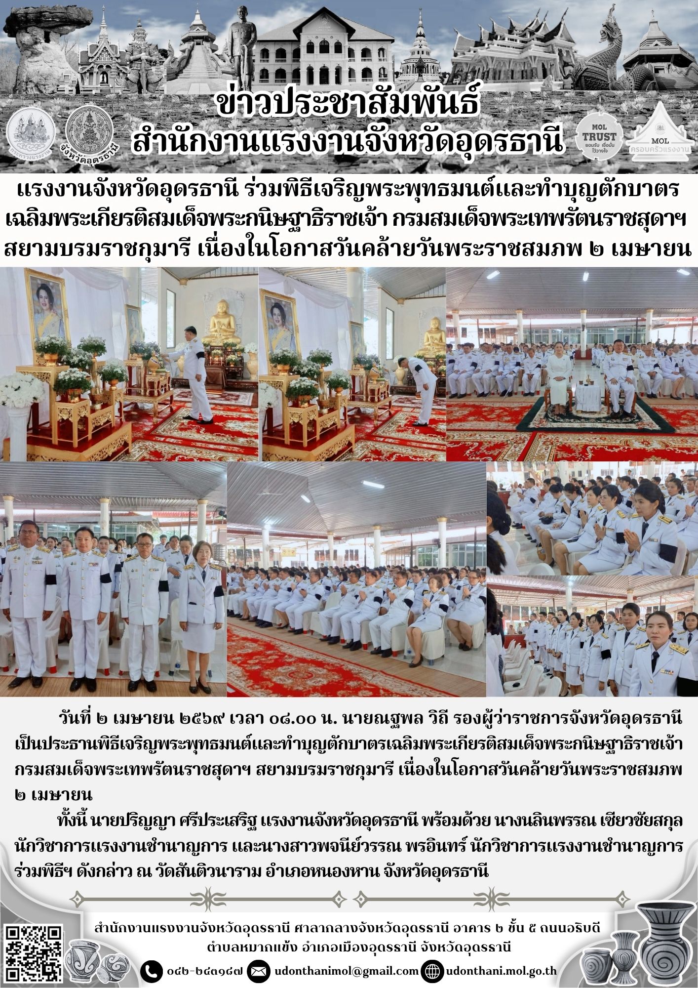 แรงงานจังหวัดอุดรธานี ร่วมพิธีเจริญพระพุทธมนต์และทำบุญตักบาตร เฉลิมพระเกียรติสมเด็จพระกนิษฐาธิราชเจ้า กรมสมเด็จพระเทพรัตนราชสุดาฯ สยามบรมราชกุมารี เนื่องในโอกาสวันคล้ายวันพระราชสมภพ ๒ เมษายน