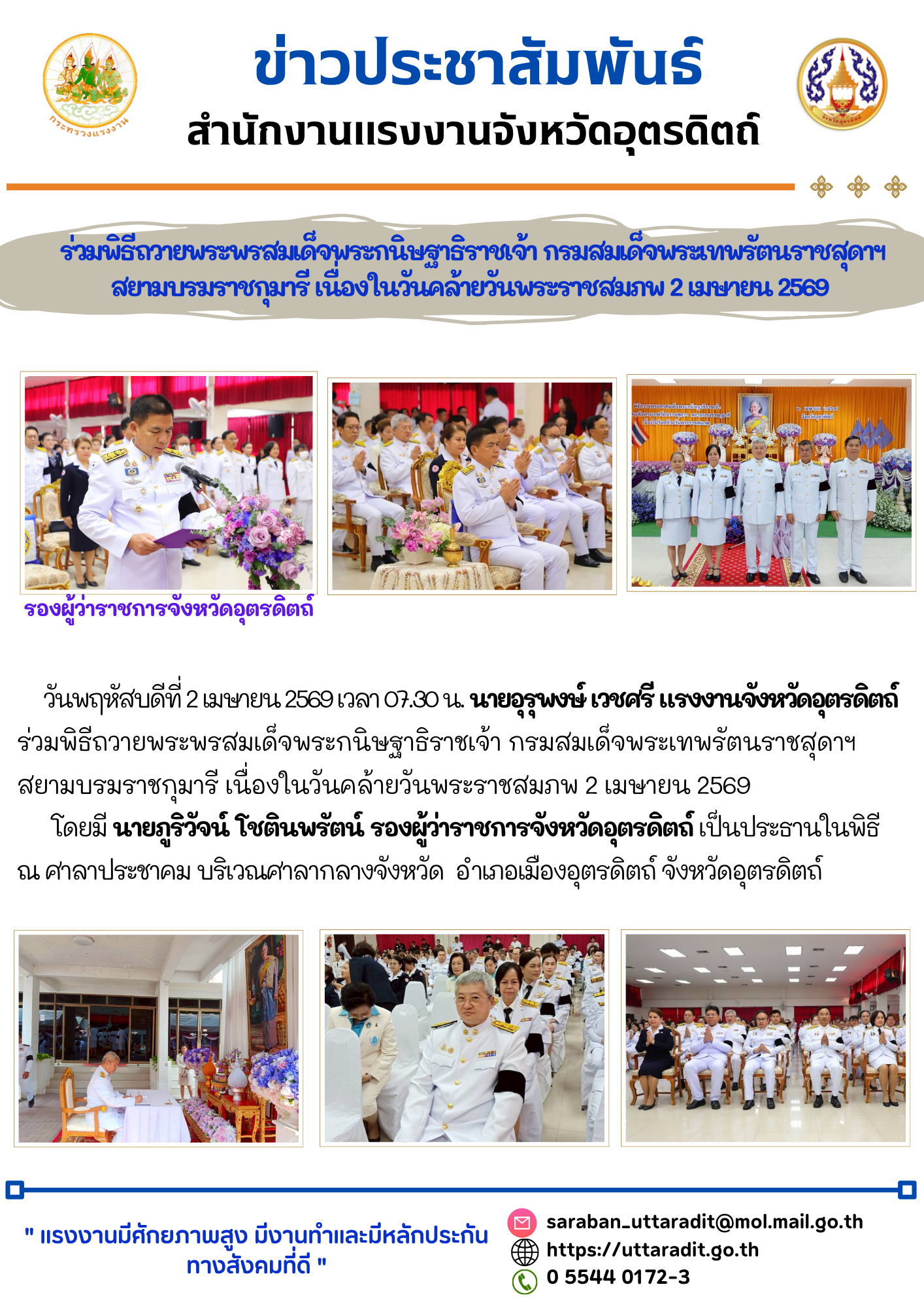 สรจ.อุตรดิตถ์ ร่วมพิธีถวายพระพรสมเด็จพระกนิษฐาธิราชเจ้า กรมสมเด็จพระเทพรัตนราชสุดาฯ สยามบรมราชกุมารี เนื่องในวันคล้ายวันพระราชสมภพ 2 เมษายน 2569