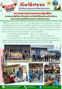 สรจ.ระยอง ร่วมตรวจสถานประกอบการกลุ่มเสี่ยง ตามแผนปฏิบัติการป้องกันการบังคับใช้แรงงานหรือบริการและการค้ามนุษย์ด้านแรงงาน ครั้งที่ 3