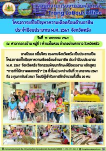 แรงงานจังหวัดตรัง เปิดโครงการแก้ไขปัญหาความเดือดร้อนด้านอาชีพ ประจำปีงบประมาณ พ.ศ.2567 จังหวัดตรัง หลักสูตร “การทำไม้กวาดดอกหญ้า” (18 ชั่วโมง)