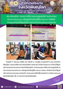 สรจ.พิษณุโลก อบรมการใช้งานระบบศูนย์บริการประชาชน กระทรวงแรงงาน หลักสูตรสำหรับผู้ใช้งานระบบ (User) สำหรับเจ้าหน้าที่ศูนย์บริการร่วมกระทรวงแรงงานจังหวัด