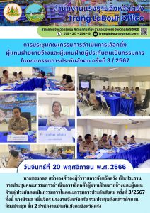 สรจ.ตรัง ร่วมการประชุมคณะกรรมการดำเนินการเลือกตั้งผู้แทนฝ่ายนายจ้างและผู้แทนฝ่ายผู้ประกันตนเป็นกรรมการในคณะกรรมการประกันสังคม ครั้งที่ 3/2567
