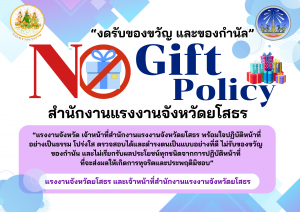 **สำนักงานแรงงานจังหวัดยโสธร No Gift Policy (งดรับของขวัญ และของกำนัล)** “แรงงานจังหวัด เจ้าหน้าที่สำนักงานแรงงานจังหวัดยโสธร พร้อมใจปฏิบัติหน้าที่อย่างเป็นธรรม โปร่งใส ตรวจสอบได้และดำรงตนเป็นแบบอย่างที่ดี ไม่รับของขวัญ ของกำนัน และไม่เรียกรับผลประโยชน์ทุกชนิดจากการปฏิบัติหน้าที่ ที่จะส่งผลให้เกิดการทุจริตและประพฤติมิชอบ”