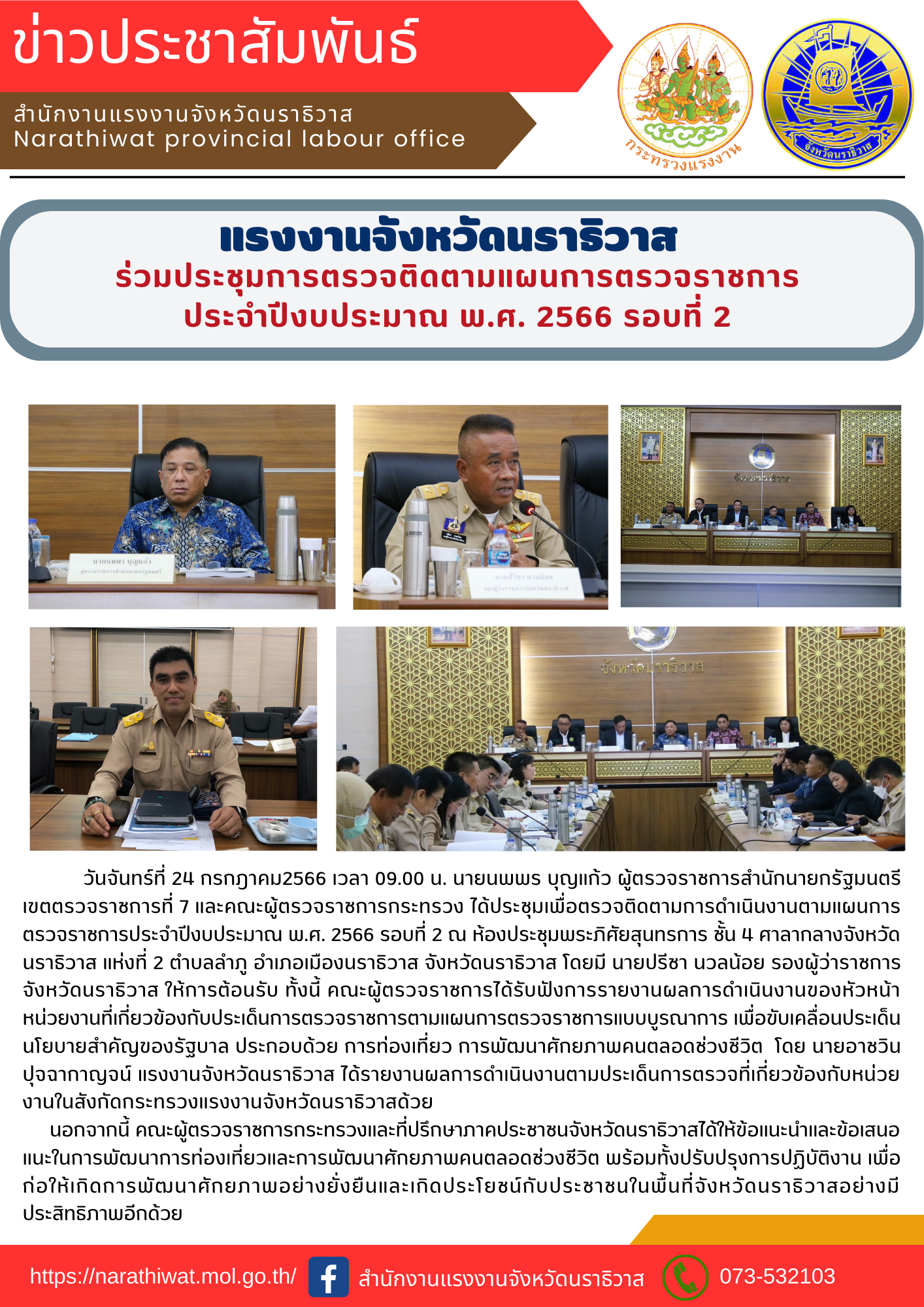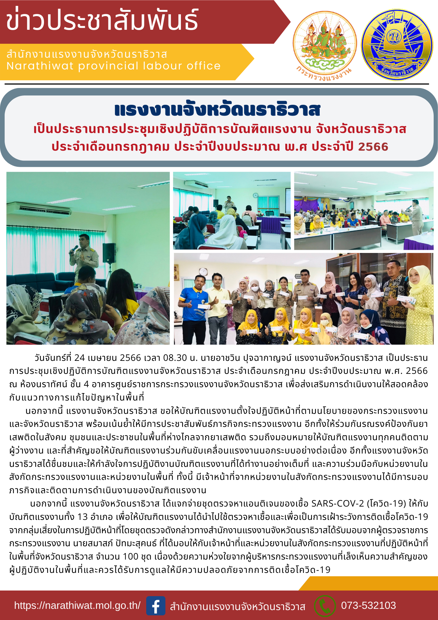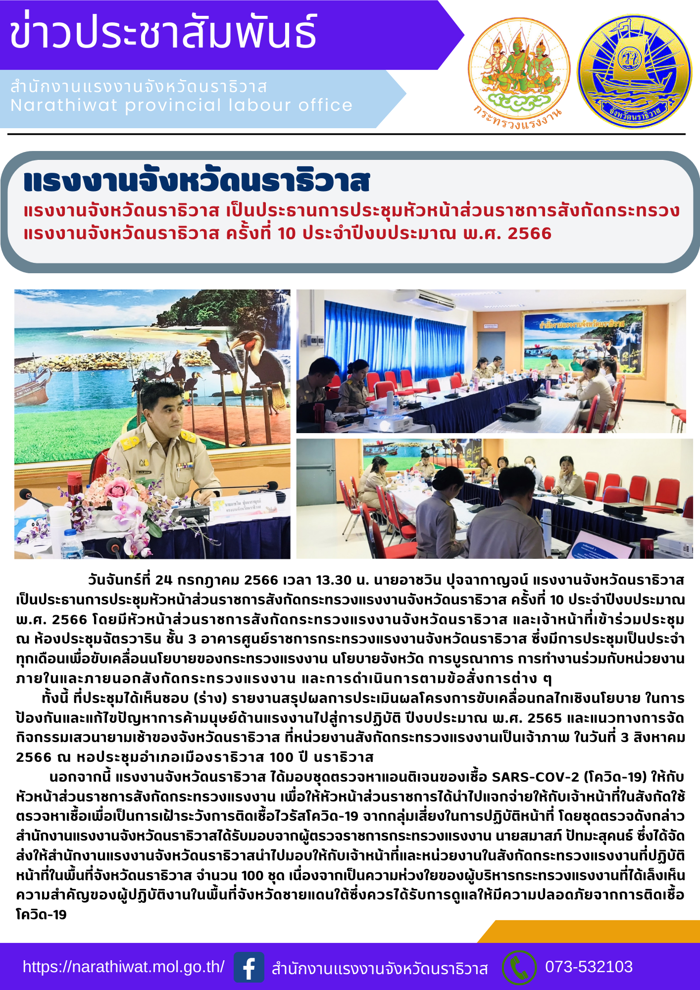 สรจ.นราธิวาส ประชุมหัวหน้าส่วนราชการสังกัดกระทรวงแรงงานจังหวัดนราธิวาส ครั้งที่ 10 ประจำปีงบประมาณ พ.ศ. 2566