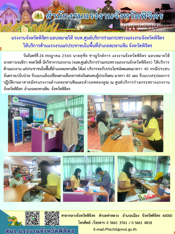 จนท.ศูนย์บริการร่วมกระทรวงแรงงานจังหวัดพิจิตร ให้บริการด้านแรงงานแก่ประชาชนในพื้นที่อำเภอตะพานหิน จังหวัดพิจิตร