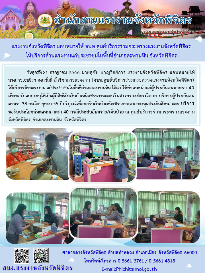 จนท.ศูนย์บริการร่วมกระทรวงแรงงานจังหวัดพิจิตร ให้บริการด้านแรงงานแก่ประชาชนในพื้นที่อำเภอตะพานหิน จังหวัดพิจิตร