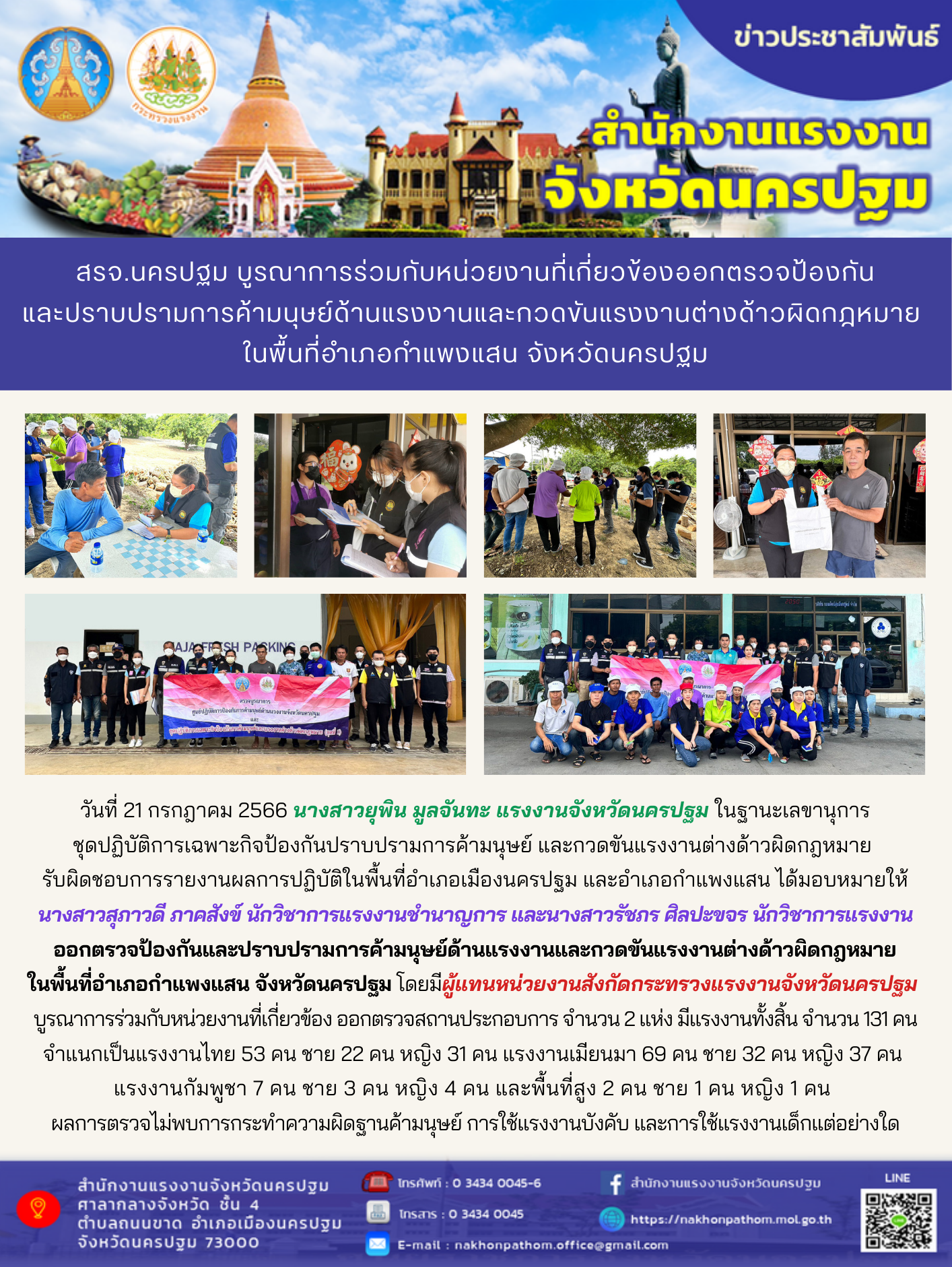 สรจ.นครปฐม บูรณาการร่วมกับหน่วยงานที่เกี่ยวข้องออกตรวจป้องกันและปราบปรามการค้ามนุษย์ด้านแรงงานและกวดขันแรงงานต่างด้าวผิดกฎหมาย ในพื้นที่อำเภอกำแพงแสน จังหวัดนครปฐม