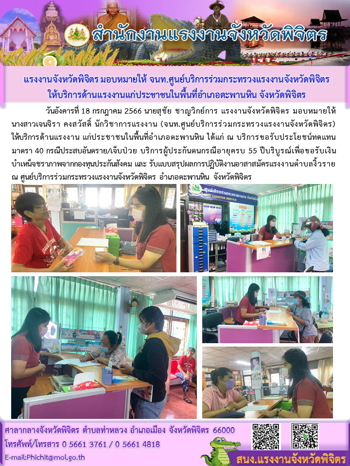 จนท.ศูนย์บริการร่วมกระทรวงแรงงานจังหวัดพิจิตร ให้บริการด้านแรงงานแก่ประชาชนในพื้นที่อำเภอตะพานหิน จังหวัดพิจิตร