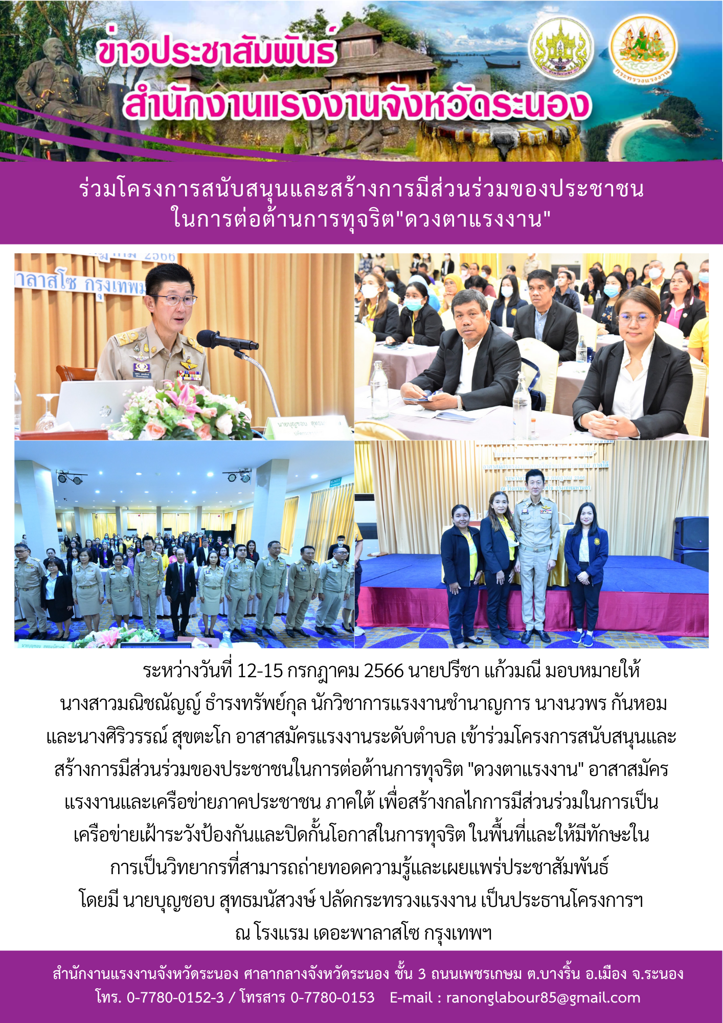 สรจ.ระนอง ร่วมโครงการสนับสนุนและสร้างการมีส่วนร่วมของประชาชน ในการต่อต้านการทุจริต”ดวงตาแรงงาน”