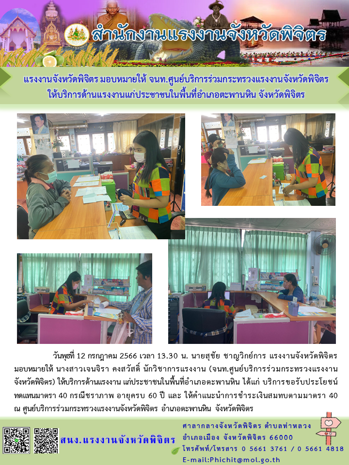 จนท.ศูนย์บริการร่วมกระทรวงแรงงานจังหวัดพิจิตร ให้บริการด้านแรงงานแก่ประชาชนในพื้นที่อำเภอตะพานหิน จังหวัดพิจิตร