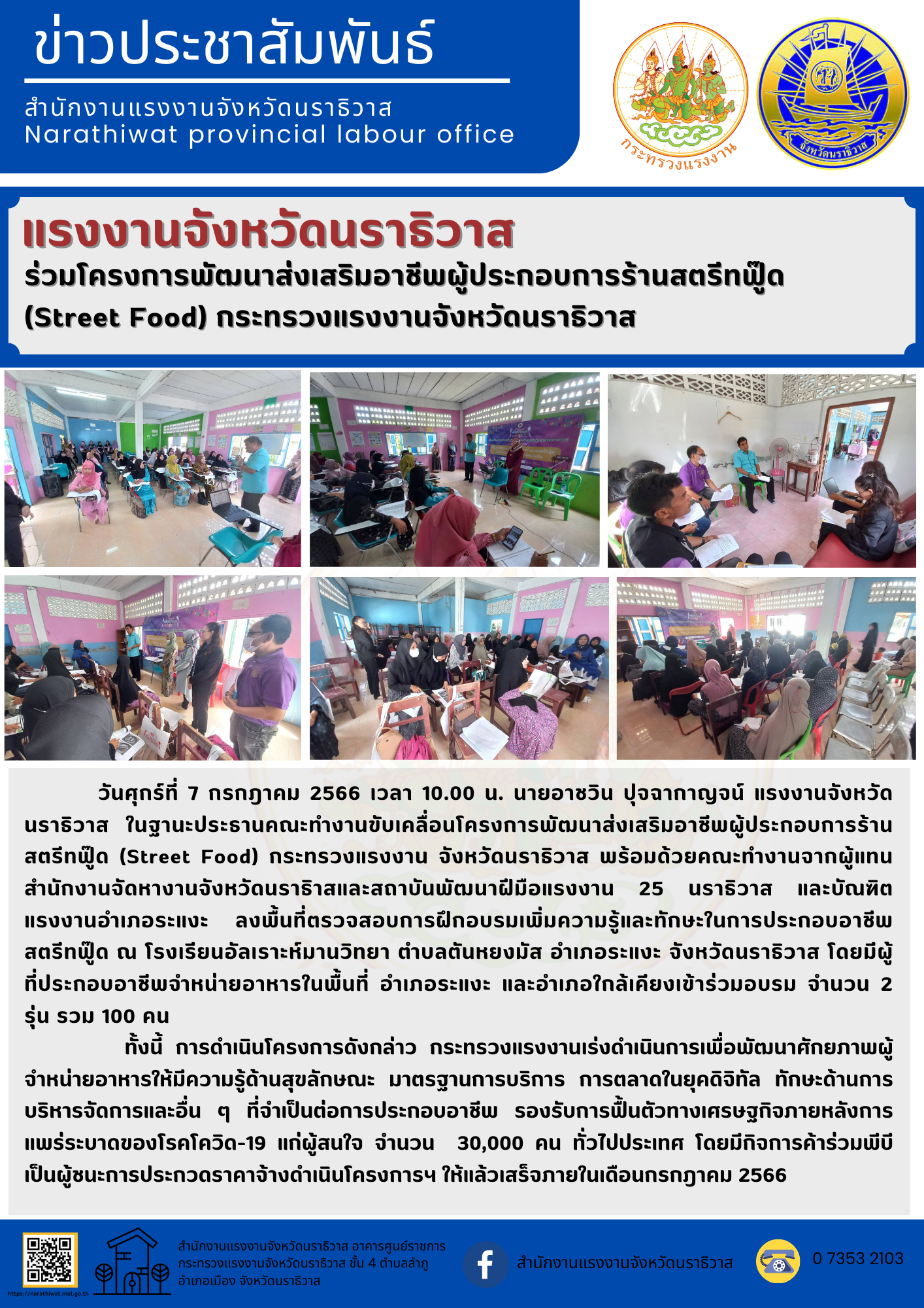 สรจ.นราธิวาส ร่วมโครงการพัฒนาส่งเสริมอาชีพผู้ประกอบการร้านสตรีทฟู๊ด (Street Food) กระทรวงแรงงานจังหวัดนราธิวาส