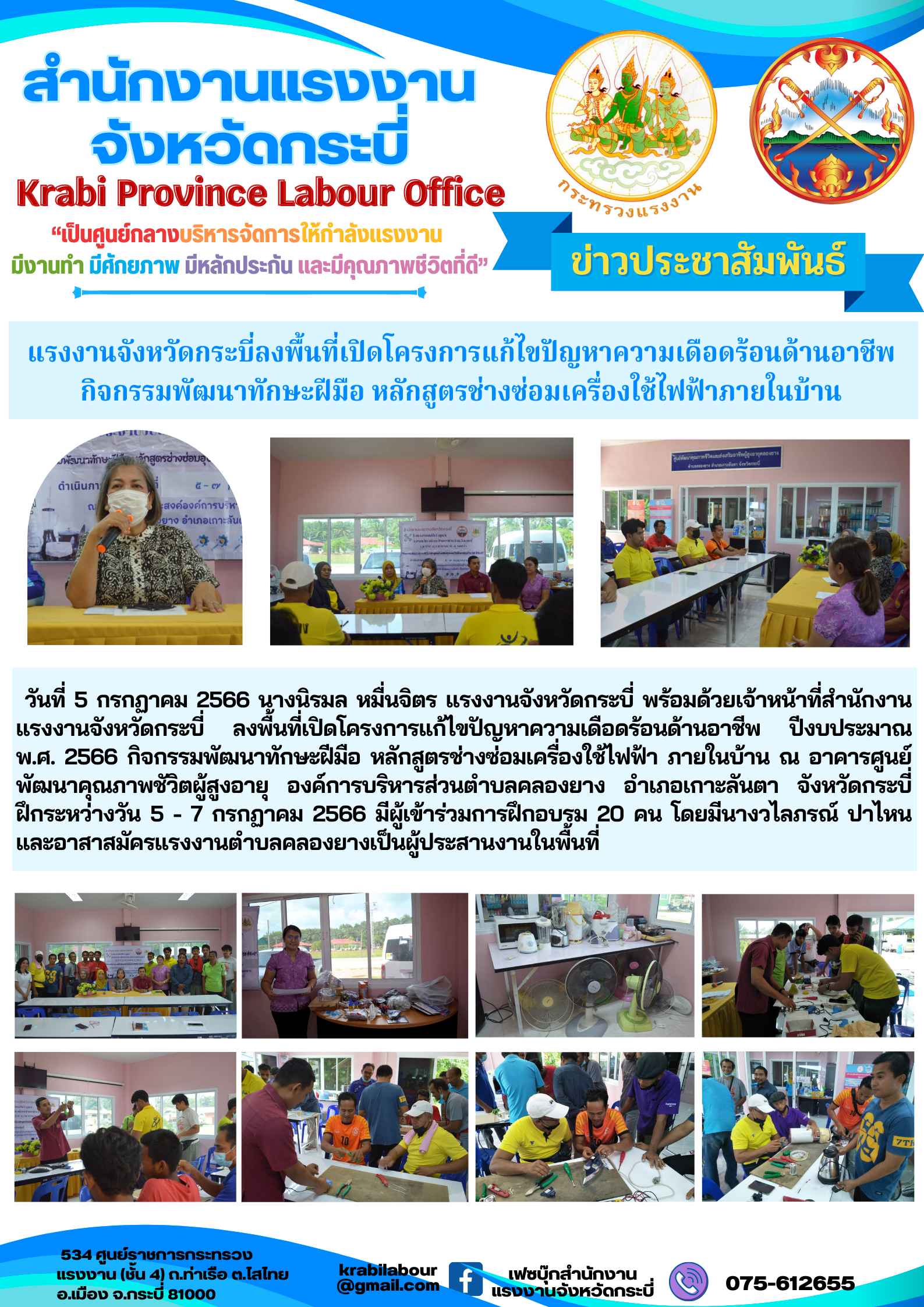 สรจ.กระบี่ ลงพื้นที่เปิดโครงการแก้ไขปัญหาความเดือดร้อนด้านอาชีพกิจกรรมพัฒนาทักษะฝีมือ หลักสูตรช่างซ่อมเครื่องใช้ไฟฟ้าภายในบ้าน