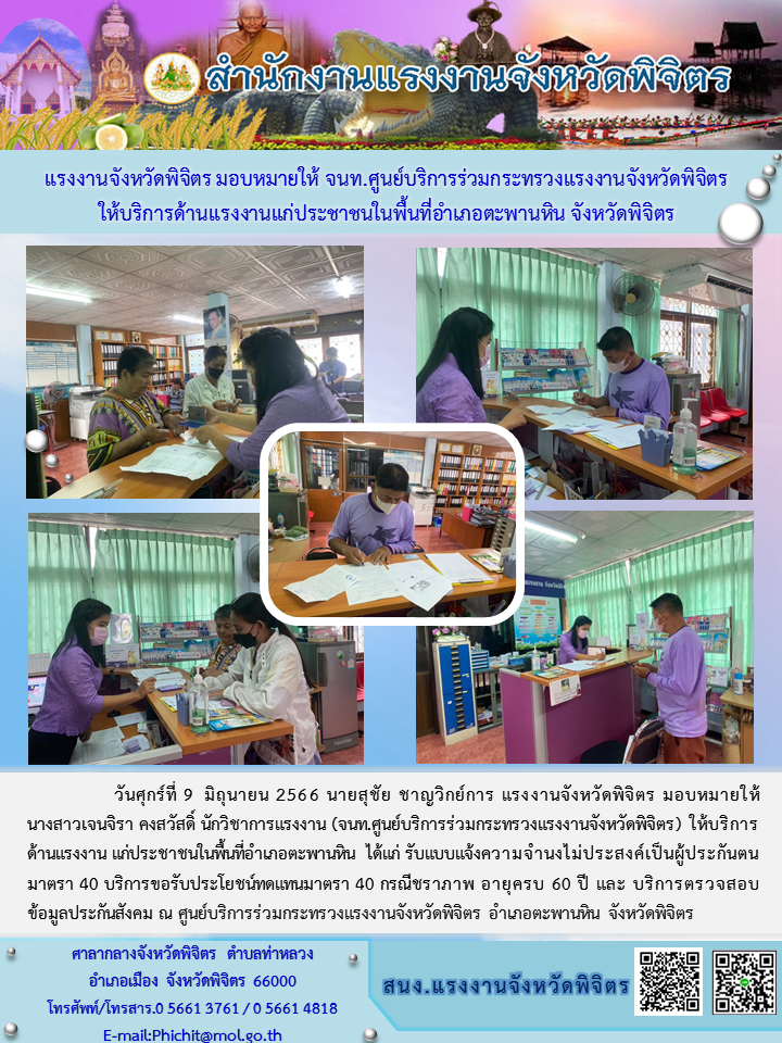 จนท.ศูนย์บริการร่วมกระทรวงแรงงานจังหวัดพิจิตร ให้บริการด้านแรงงานแก่ประชาชนในพื้นที่อำเภอตะพานหิน จังหวัดพิจิตร
