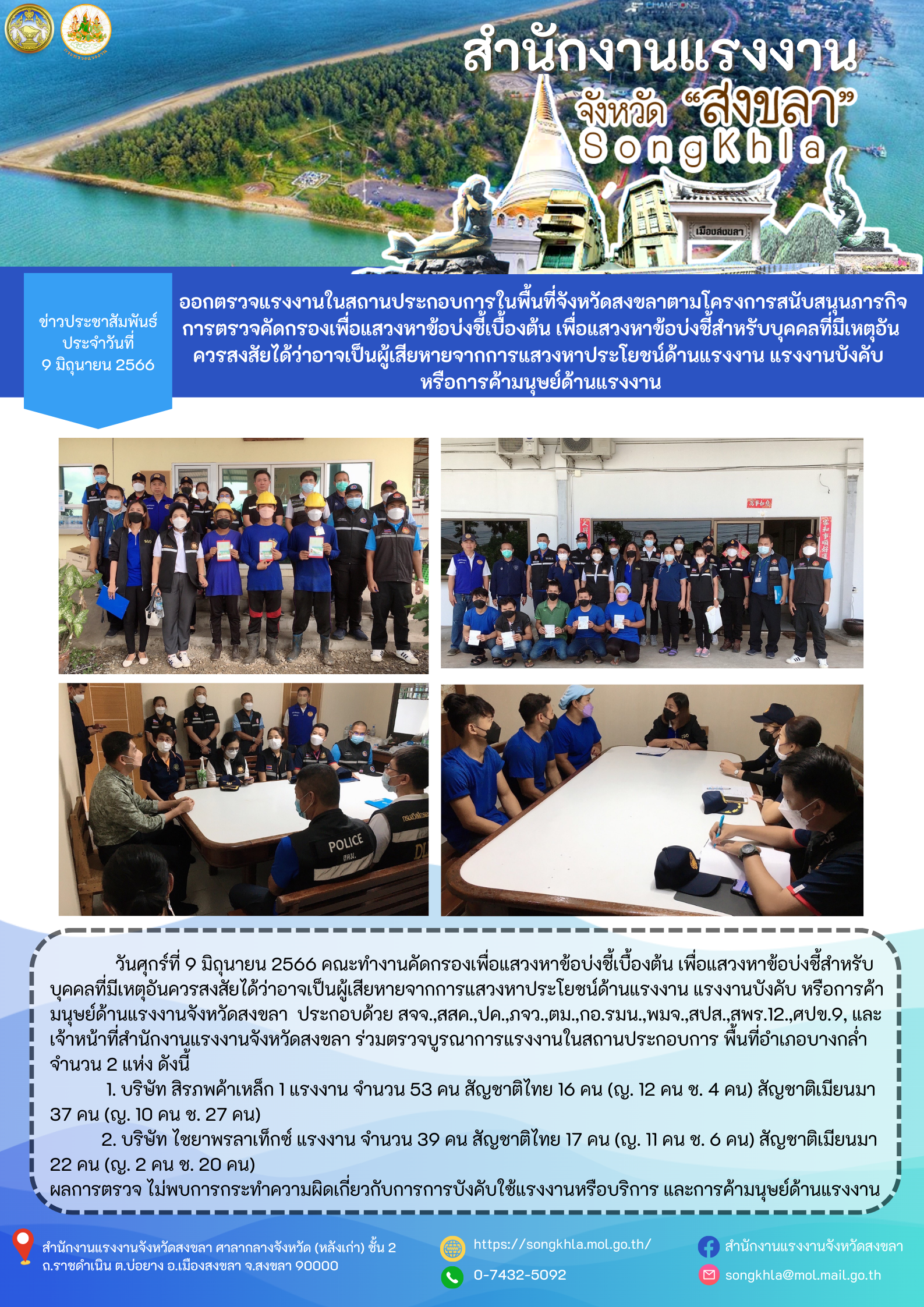 สรจ.สงขลา ออกตรวจแรงงานในสถานประกอบการในพื้นที่จังหวัดสงขลาตามโครงการสนับสนุนภารกิจ การตรวจคัดกรองเพื่อแสวงหาข้อบ่งชี้เบื้องต้น เพื่อแสวงหาข้อบ่งชี้สำหรับบุคคลที่มีเหตุอันควรสงสัยได้ว่าอาจเป็นผู้เสียหายจากการแสวงหาประโยชน์ด้านแรงงาน แรงงานบังคับ หรือการค้ามนุษย์ด้านแรงงาน