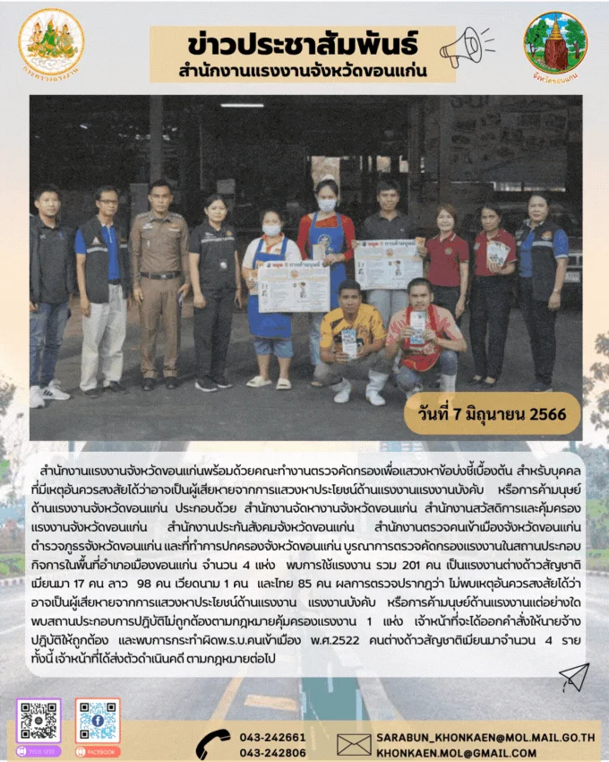 สรจ.ขอนแก่น พร้อมด้วยคณะทำงานตรวจคัดกรองเพื่อแสวงหาข้อบ่งชี้เบื้องต้น เพื่อแสวงหาข้อบ่งชี้สำหรับบุคคลที่มีเหตุอันควรสงสัยได้ว่าอาจเป็นผู้เสียหายจากการแสวงหาประโยชน์ด้านแรงงาน แรงงานบังคับ หรือการค้ามนุษย์ด้านแรงงานจังหวัดขอนแก่น