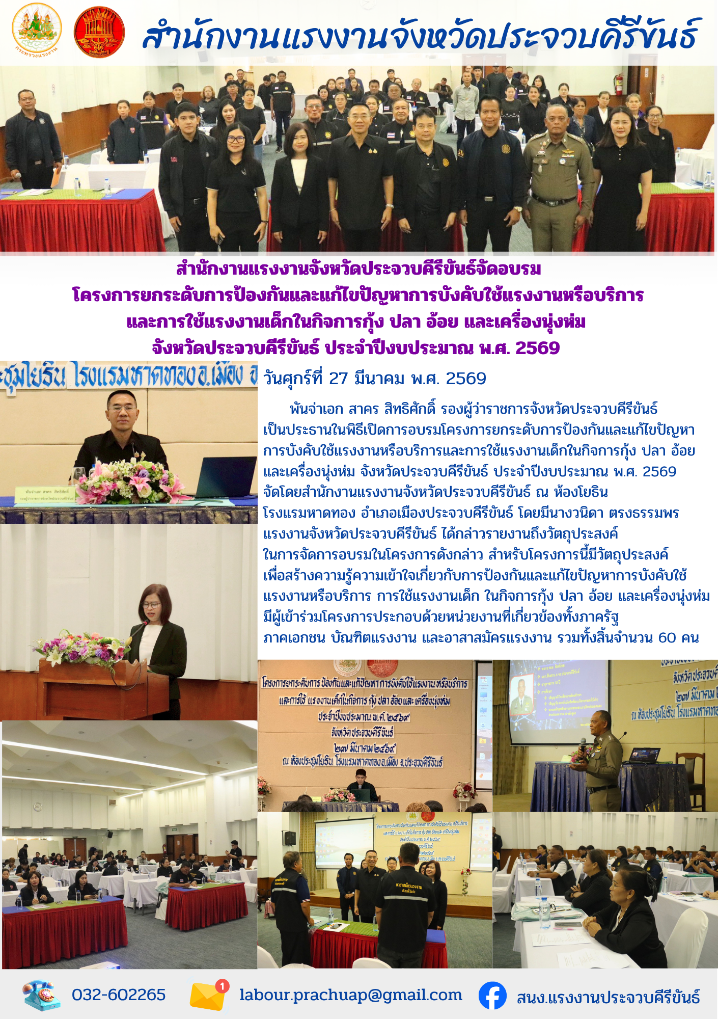 สำนักงานแรงงานจังหวัดประจวบคีรีขันธ์จัดอบรม โครงการยกระดับการป้องกันและแก้ไขปัญหาการบังคับใช้แรงงานหรือบริการ และการใช้แรงงานเด็กในกิจการกุ้ง ปลา อ้อย และเครื่องนุ่งห่ม จังหวัดประจวบคีรีขันธ์ ประจำปีงบประมาณ พ.ศ. 2569